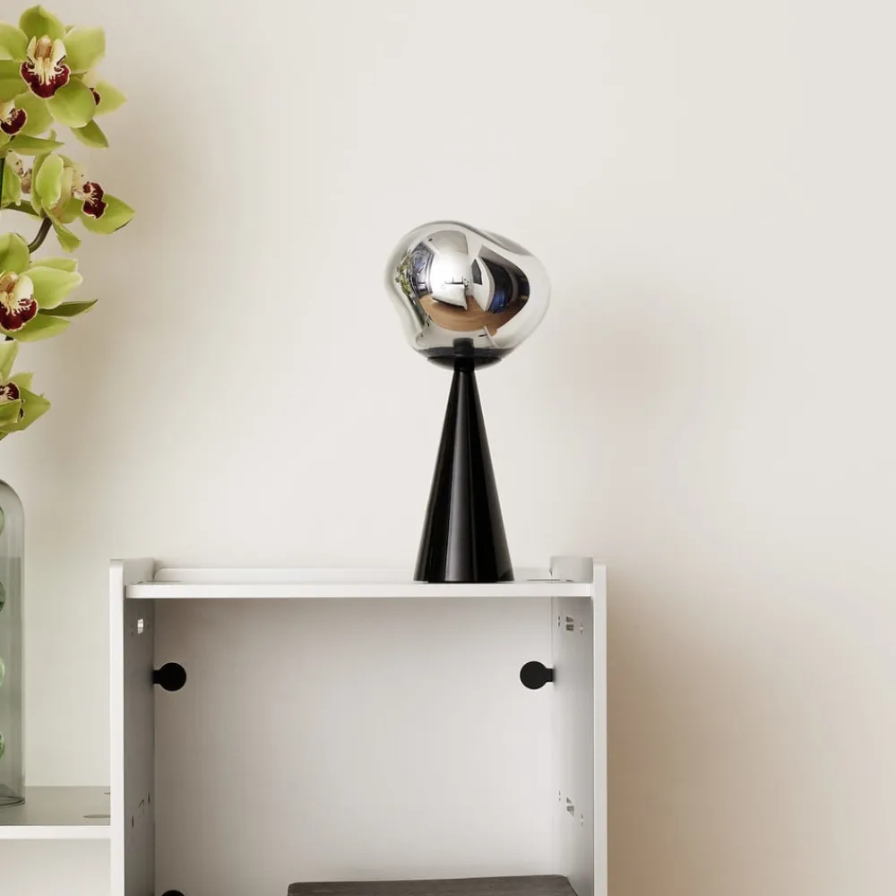 LED-bordlampen med batteri Melt Portable er en designer-bordlampe, der imponerer med sin usædvanlige form og lyseffekt. Skærmen skaber en fascinerende effekt, der minder om smeltende glas, en gletscher eller universet. Med Melt udvides den ligeledes navngivne serie fra Tom Dixon med en bærbar variant. LED-modulet er integreret og giver en varmhvid lysfarve med en farvetemperatur på 3.000 Kelvin. Den integrerede touch-dæmper gør det muligt at indstille lysstyrken individuelt. Derudover har Melt en meget god farvegengivelse (CRI> 90).