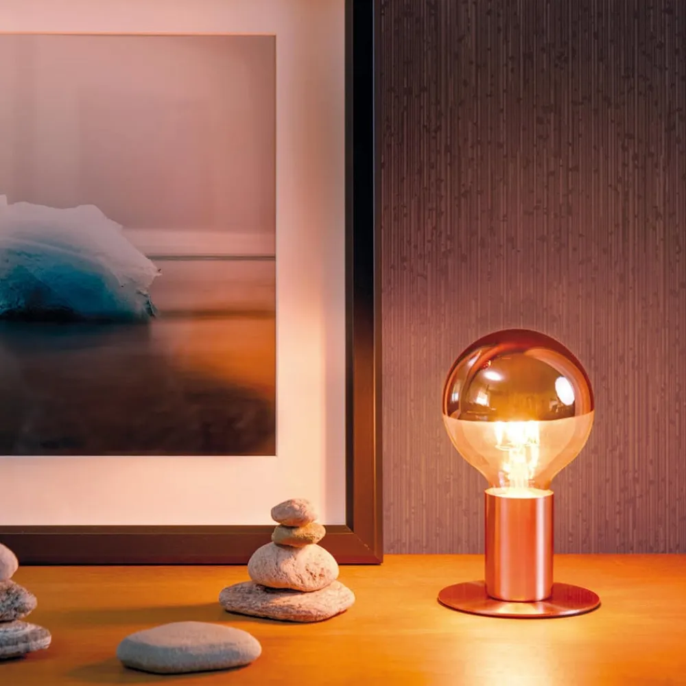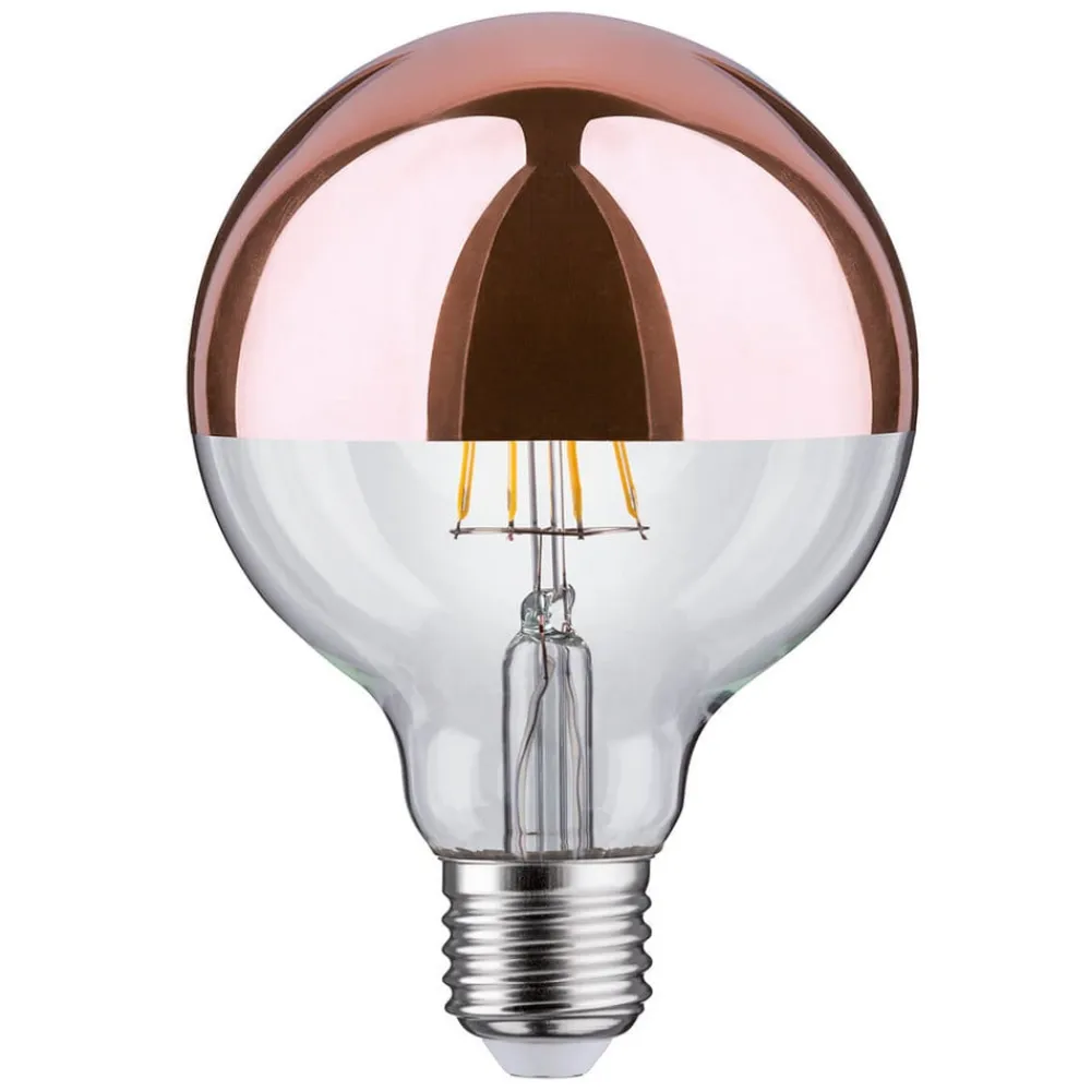 Vintage eller industrielt, skandinavisk eller moderne – LED globelampen med hovedspejl i den trendy farve kobber sætter enhver indretningsstil i det rette lys. Kuglen med en diameter på 9,5 cm er særlig attraktiv i dekorative armaturer og burarmaturer. Men det er også et ægte blikfang i åbne pendler eller loftsarmaturer. Tekniske data