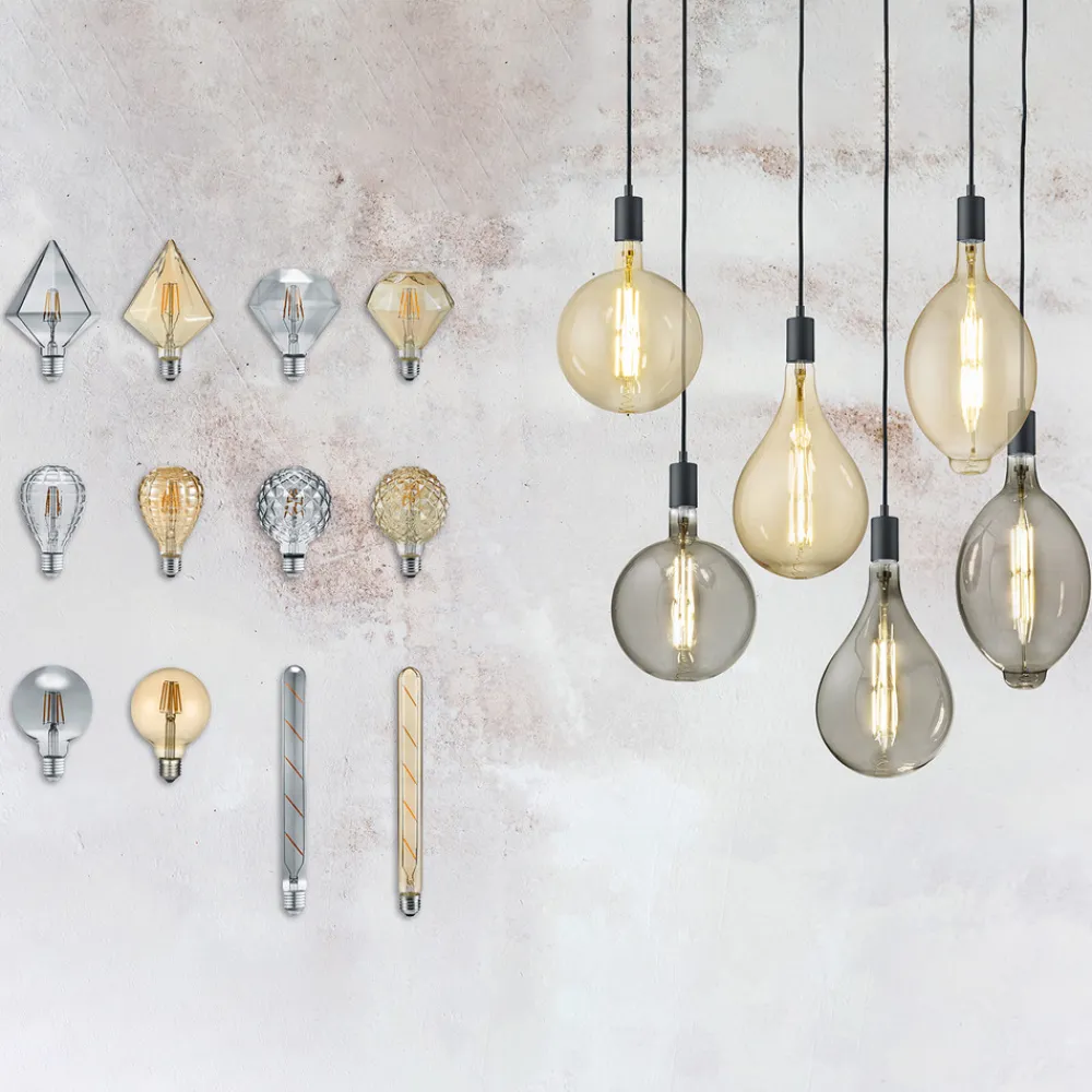 Trendy lamper, der udelukkende er designet med en fatning og uden skærm, er det primære anvendelsesområde for denne dekorative lyskilde med E27-sokkel. Det i sig selv meget varme lys med 2.700 K fra LED’er, som er placeret med filamentteknik, gøres endnu mere behageligt og varmere af det ravfarvet tonede glas. Lyskilden er også et blikfang i såkaldt burlamper.