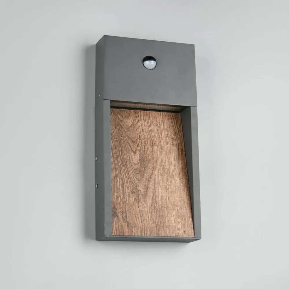 LED-sensor-udendørs LED-væglampe SALMON kombinerer moderne design med et tiltalende trælook og skaber en harmonisk atmosfære i udendørsarealer. Med sin kapslingsgrad IP44 er den optimalt beskyttet mod stænkvand og er perfekt til brug på husvægge eller indgangsområder. Det varmhvide lys med en farvetemperatur på 3.000 K skaber en behagelig og indbydende belysning, der forener funktionalitet og æstetik.