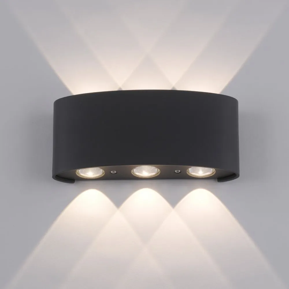 Den antracitfarvede LED-væglampe Carlo overbeviser med sit moderne og enkle design. De tre pærer, der monteret øverst og nederst på den halvrunde lampe, giver fantastiske lyskoner, der overlapper hinanden på dekorativ vis og dermed skaber et smukt, dekorativt lys. I alt er der seks fastmonterede, varmhvide LED’er. Takket være LED-teknikken er lampen energibesparende og overbeviser med lav varmeudvikling og lang levetid. Væglampe er velegnet til både indendørs og udendørs brug takket være kapslingsgrad IP54. Sæt et imponerende præg med den moderne LED-væglampe rundt om dit hus. Den ideelle lampe til indendørs og udendørs brug. Sæt et særligt blikfang på dine husvægge med lampen, uanset om det er i gangene eller i entréen.