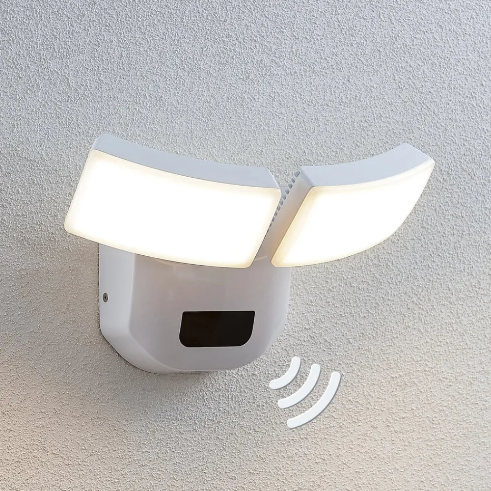 2 lyskilder LED udendørs vægspot Nikias med sensor og bevægelige lampehoveder, saltvandsresistent Denne LED udendørs vægspot har en hvid overflade og er kendetegnet ved sit høje funktionsniveau. De to lampehoveder kan drejes og svinges (90° horisontalt/180° vertikalt), så lyset kan justeres præcist. Der er også integreret en bevægelsessensor, som betyder, at lyset reagerer på bevægelse i omgivelserne og tænder med det samme, når der er brug for lys. Lyset er saltvandsresistent og har en IK06-slagstyrke, hvilket gør det særligt robust. Sensordata: – Rækkevidde 12 m x 6 m – Lysvarighed justerbar (5 s/90 s/5 min/15 min) – Registreringsvinkel 150°