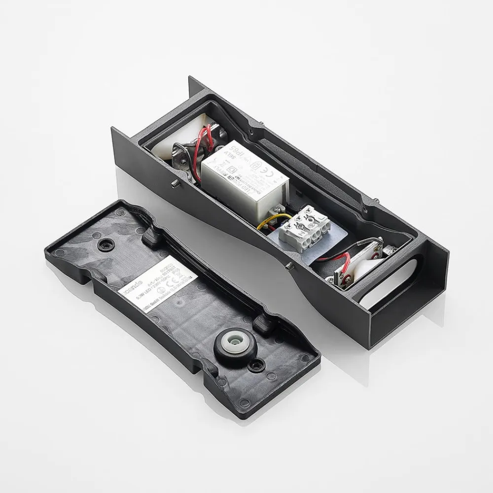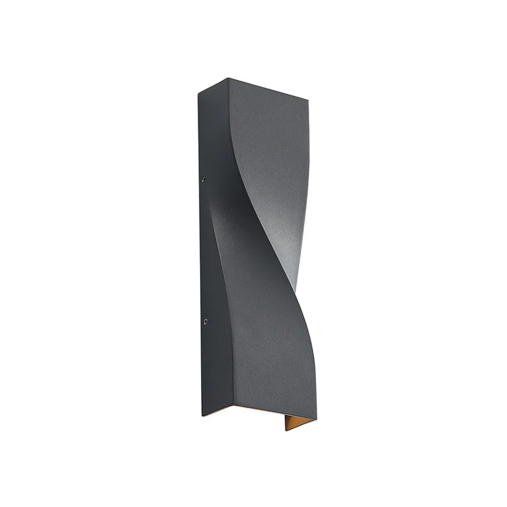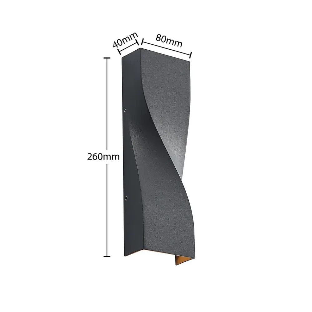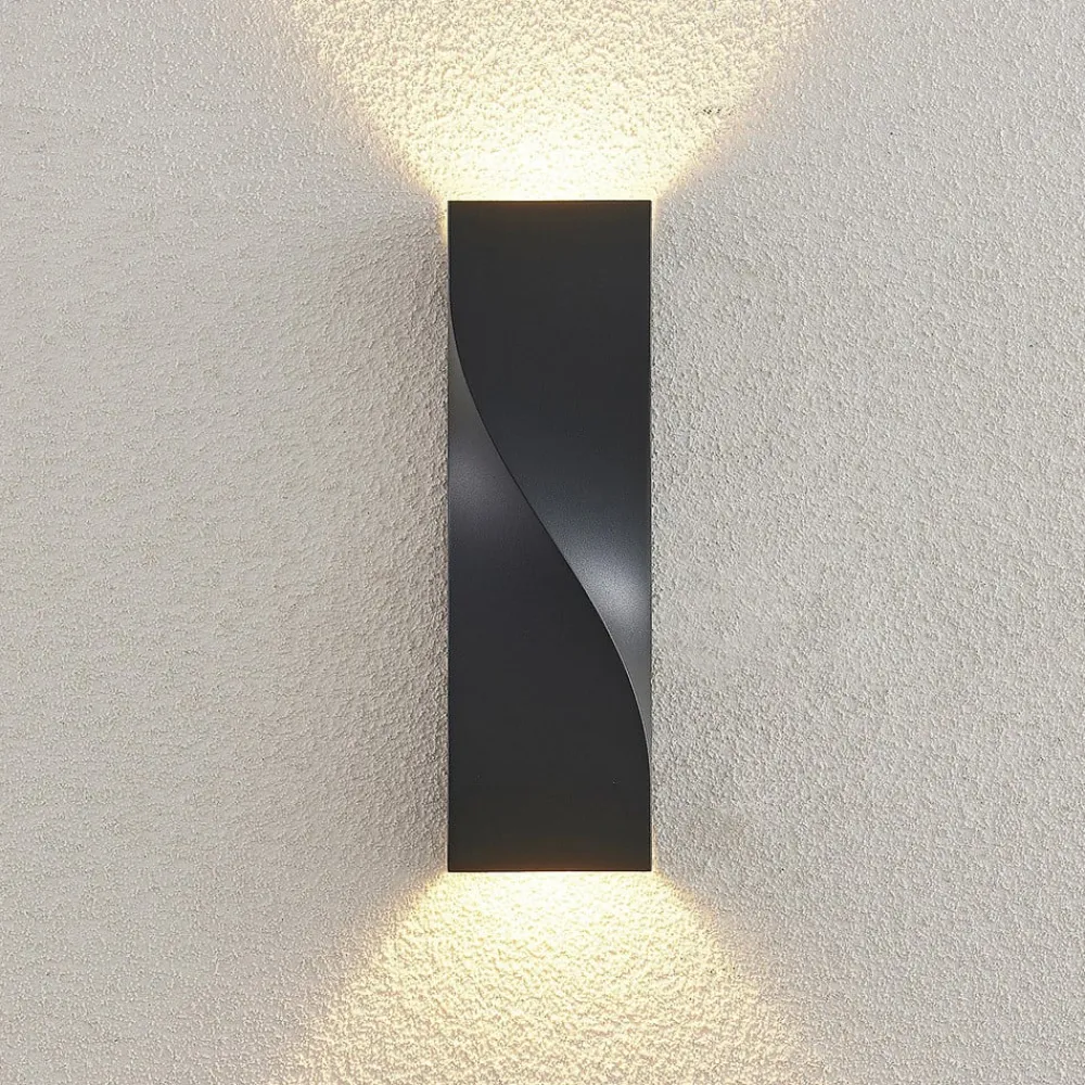 Moderne up/down-lys – Tibelya udendørs LED-væglampe Formen på Tibelya udendørs LED-væglampe er et blikfang, selv i dagslys. Armaturet er rektangulært i sin grundform og elegant snoet på forsiden for et særligt sofistikeret look. Det antracitfarvede aluminium, som Tibelya-armaturet er fremstillet af, har et enkelt, men robust udseende af høj kvalitet. Udendørslampens sande skønhed afsløres dog først i mørket, når de to integrerede LED-lyskilder spotlighter opad og nedad langs husmuren og skaber en særlig lyseffekt.