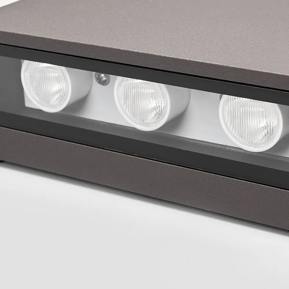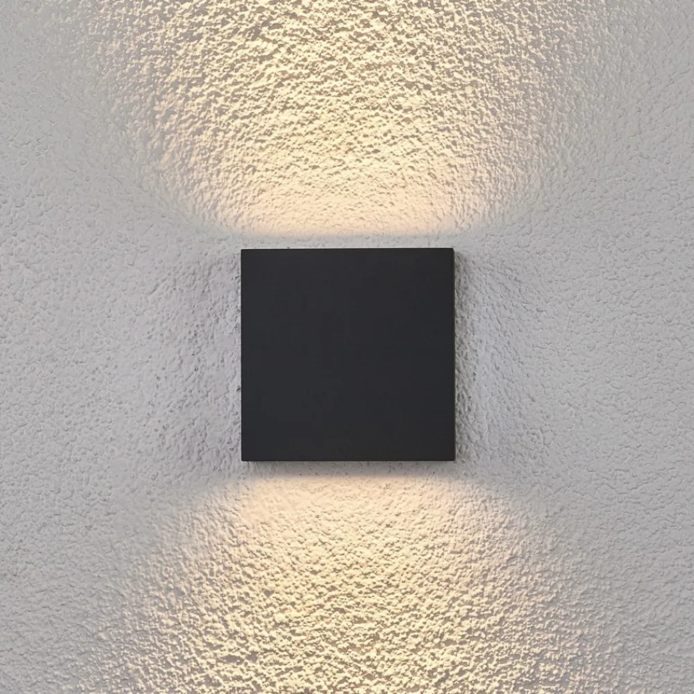 Firkantet Trixy udendørs LED-væglampe af grafitgråt lakeret aluminium Trixy er en udendørs LED-væglampe med et meget tidløst design, der kun består af en mørkegrå aluminiumskrop i en kantet form. Den er udstyret med 6 højkvalitets-LED’er fra Cree, hvoraf tre er placeret i toppen og tre i bunden. Lyset ser meget imponerende ud, selv på afstand, når det skinner opad og nedad og skaber et imponerende lysbillede på væggen bagved. Den nøgterne, puristiske form passer selvfølgelig godt til moderne omgivelser, men der er heller ikke noget til hinder for, at den udendørs LED-væglampe kan kombineres med klassiske eller endda historiske bygninger.