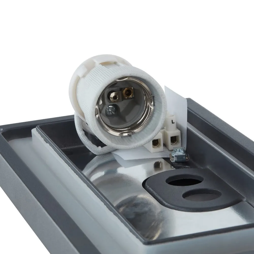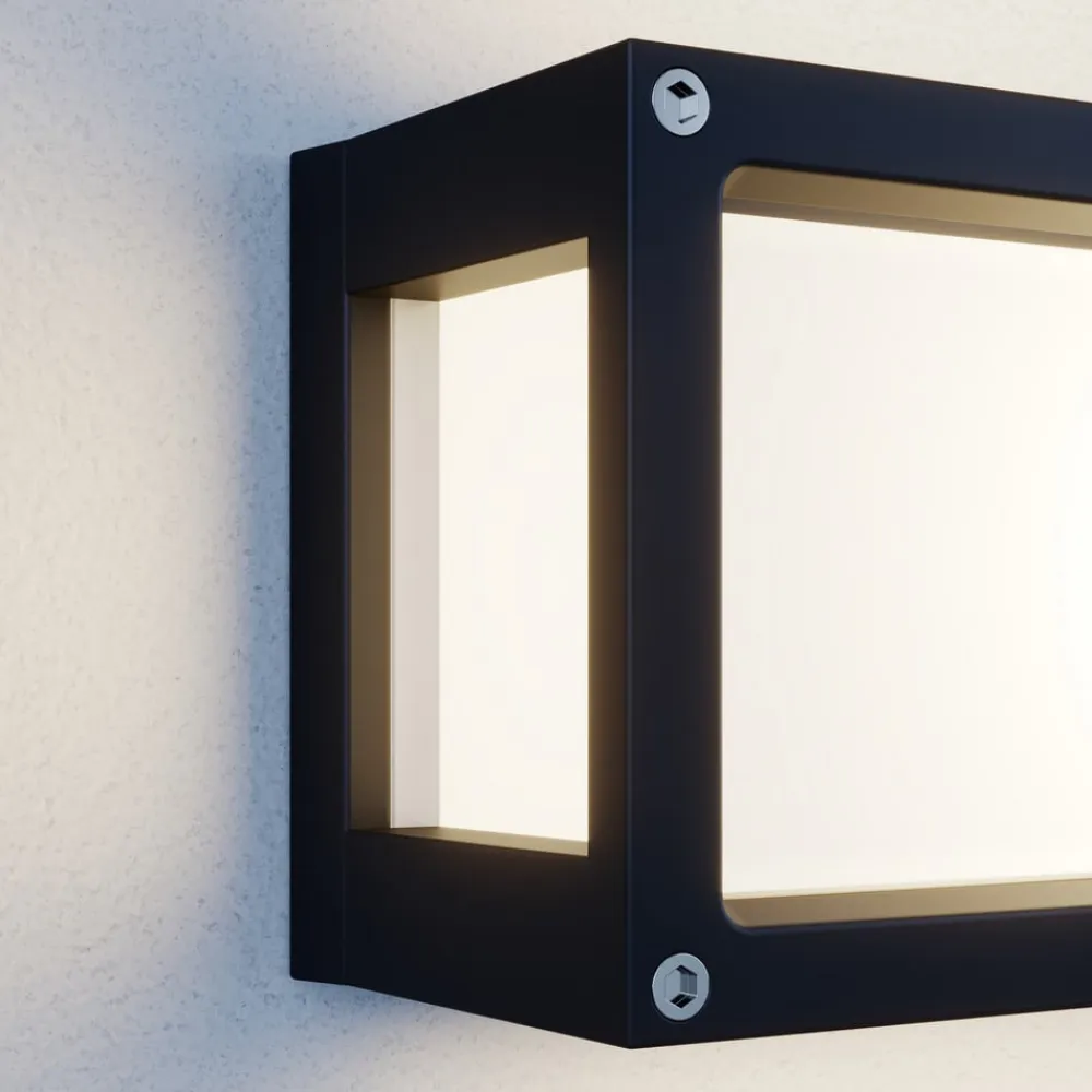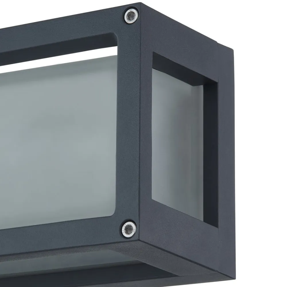 Mørkegrå indrammet udendørs væglampe Aurelien i en kantet form Aurelien passer godt til moderne arkitektur, ikke mindst på grund af sit lineære design. En hvid glasskærm suppleres harmonisk af en ramme i trykstøbt aluminium i mørkegrå. Ved brug af E27-pærer skal man være opmærksom på, at det er energispare- eller LED-pærer.
