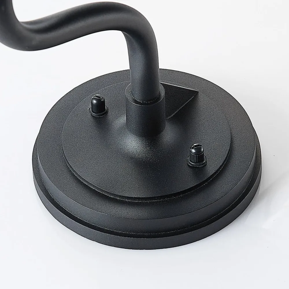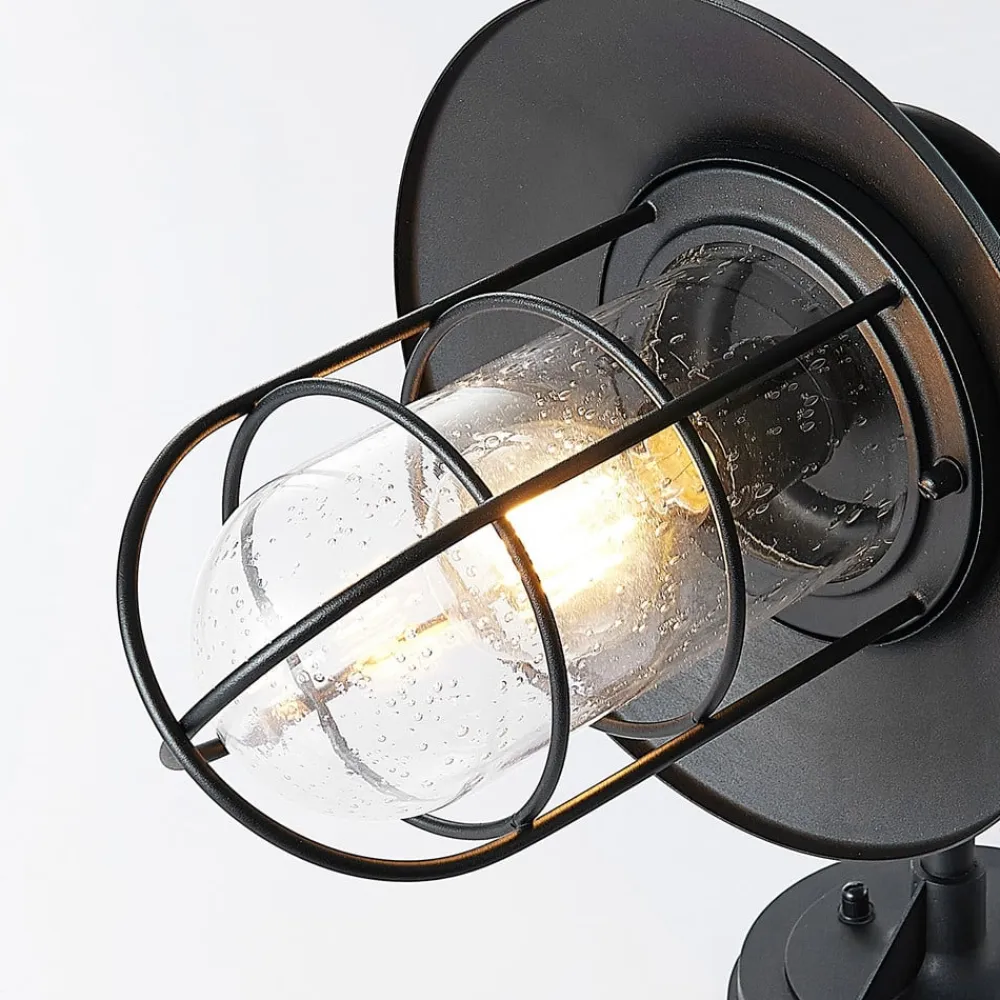 Nostalgisk Kyan udendørs væglampe i bueform Den smukt formede Kyan udendørs væglampe ser godt ud udendørs ved husindgange, på terrasser eller verandaer. Med sin buede form og beskyttende glaskrop med metalgitter ser den særlig harmonisk ud på ældre bygninger. Det klare glas, som kan indeholde små indesluttede luftbobler, giver et klart udsyn til pæren. Brug af dekorative filamentpærer eller retrofitpærer kan yderligere forbedre armaturets nostalgiske effekt.