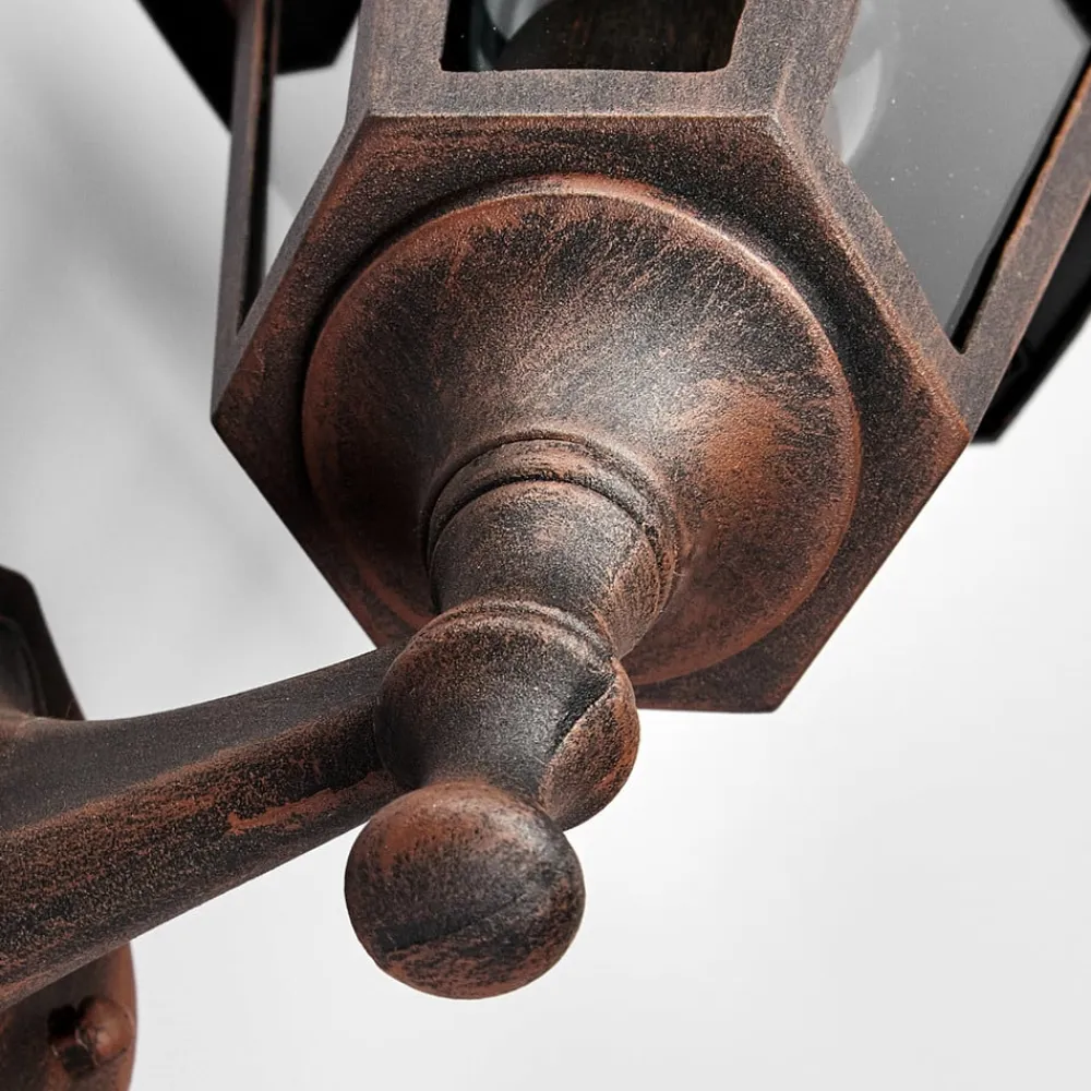 Lamina udendørs væglampe i form af en lygte Denne udendørs væglampe har en klassisk form, der ligner en lygte, ikke bare ved andet øjekast. I alt seks klare glasruder er sat ind i siderne af metalrammen, som har en slags tag. Smukke detaljer pryder også det overordnede look. Lamina udendørs væglampe er velegnet til mange klassisk designede miljøer og kan monteres med alle egnede lamper, der har en E27-sokkel. Det gælder ikke kun gløde- og halogenpærer, men også spare- og LED-pærer.