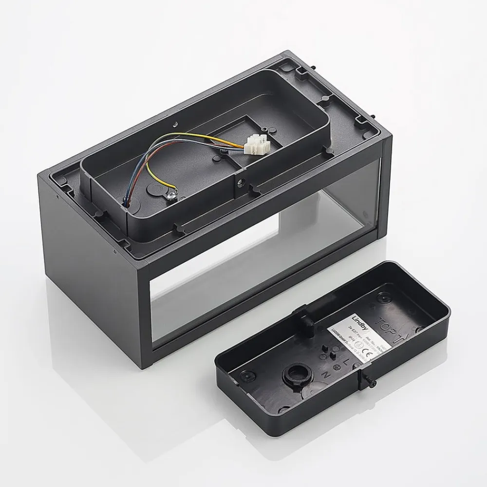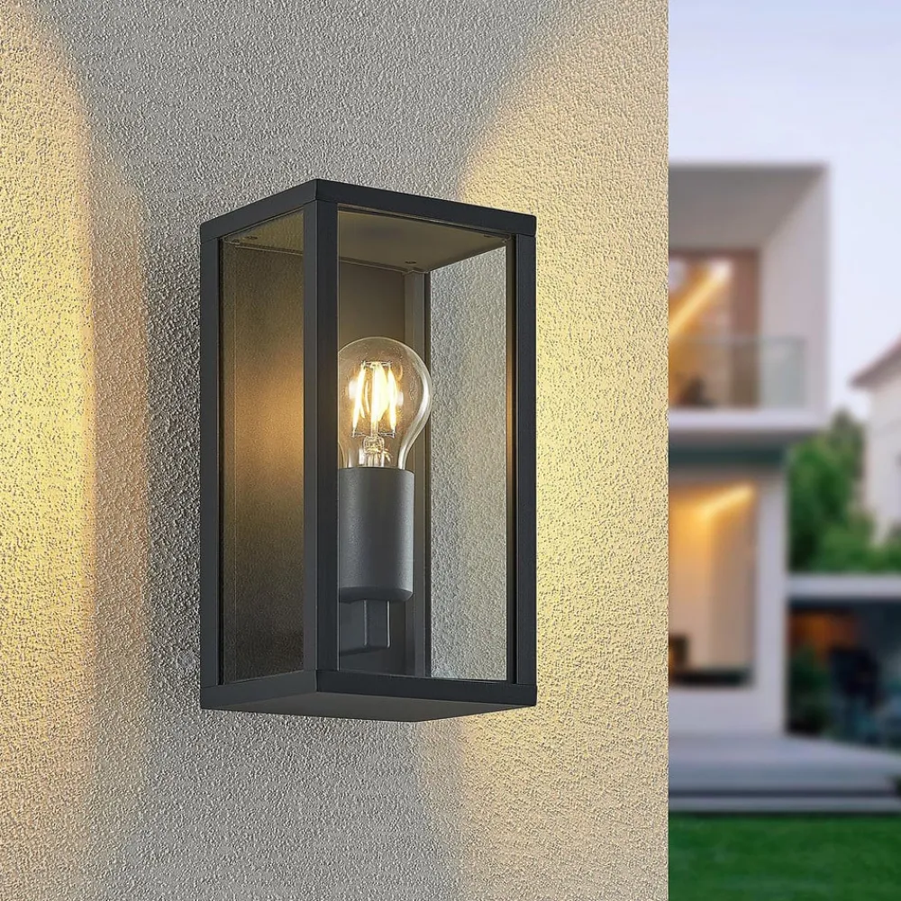 Peldar udendørs væglampe til belysning af terrasser og indgange Den mørkegrå Peldar udendørs væglampe imponerer med sine klart definerede former og sit markante udseende. Huset har en rektangulær form og er lavet af aluminium. Lampeskærmen er lavet af glas og giver derfor et klart udsyn til lyskilden. Af denne grund skal den lyskilde, der skal bruges, vælges med omhu. Energibesparende LED-pærer med et trendy glødetrådslook eller et nostalgisk rustikt look er ideelle her.