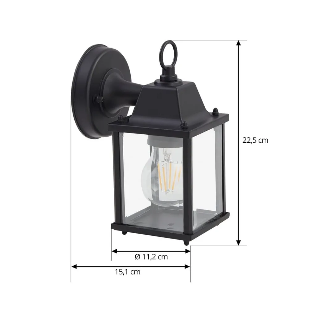 Rurik udendørs væglampe: rustikt design møder funktionalitet Rurik udendørs væglampe kombinerer robuste materialer med et design, der minder om traditionel landhusstil. Lampen er fremstillet af aluminium og glas af høj kvalitet og har ikke kun et tiltalende sort look, men også den nødvendige holdbarhed til udendørs brug. Uanset om det er på terrassen eller balkonen eller på facaden – Rurik sætter accenter og skaber en indbydende atmosfære. E27-fatningen giver fleksibilitet i valget af lyskilde, så der kan skabes individuelle lysforhold. Selvom der ikke medfølger en dæmper, kan lysstyrken justeres ved hjælp af en ekstern dæmper for at skabe den ønskede stemning.