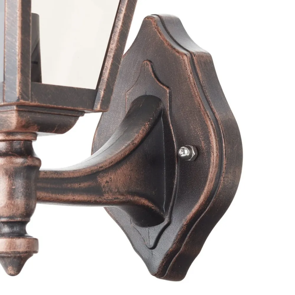 Kobberlooket giver Toulouse udendørs væglampe en klassisk charme Toulouse udendørs væglampe ser ud til at være modelleret efter tidligere tiders stil og giver udendørsarealer en helt særlig atmosfære. Den strukturerede ramme af pulverlakeret aluminium i et antikt kobberlook gør også lampen til et attraktivt blikfang. Med en IP43-beskyttelsesgrad er Toulouse optimalt beskyttet mod indtrængning af fremmedlegemer fra 2,5 mm og vandsprøjt. Denne udendørs væglampe er også kompatibel med energisparepærer, hvilket gør den endnu mere attraktiv.