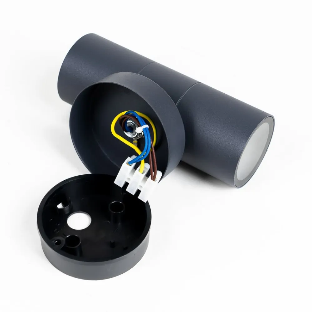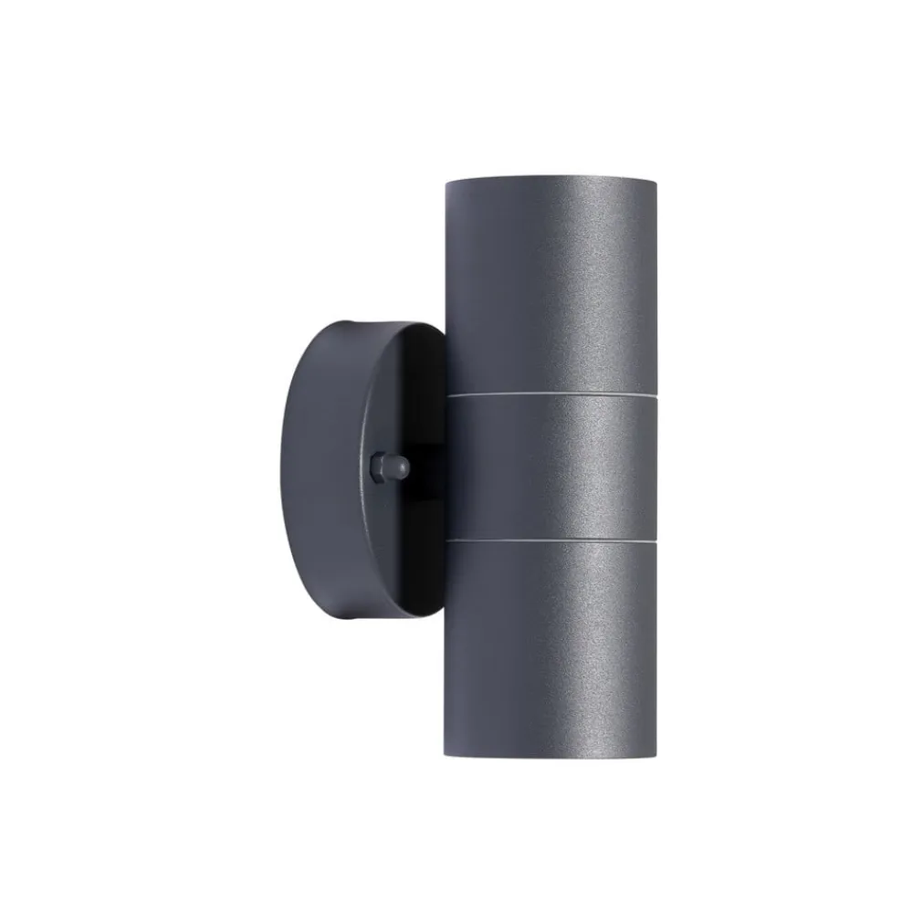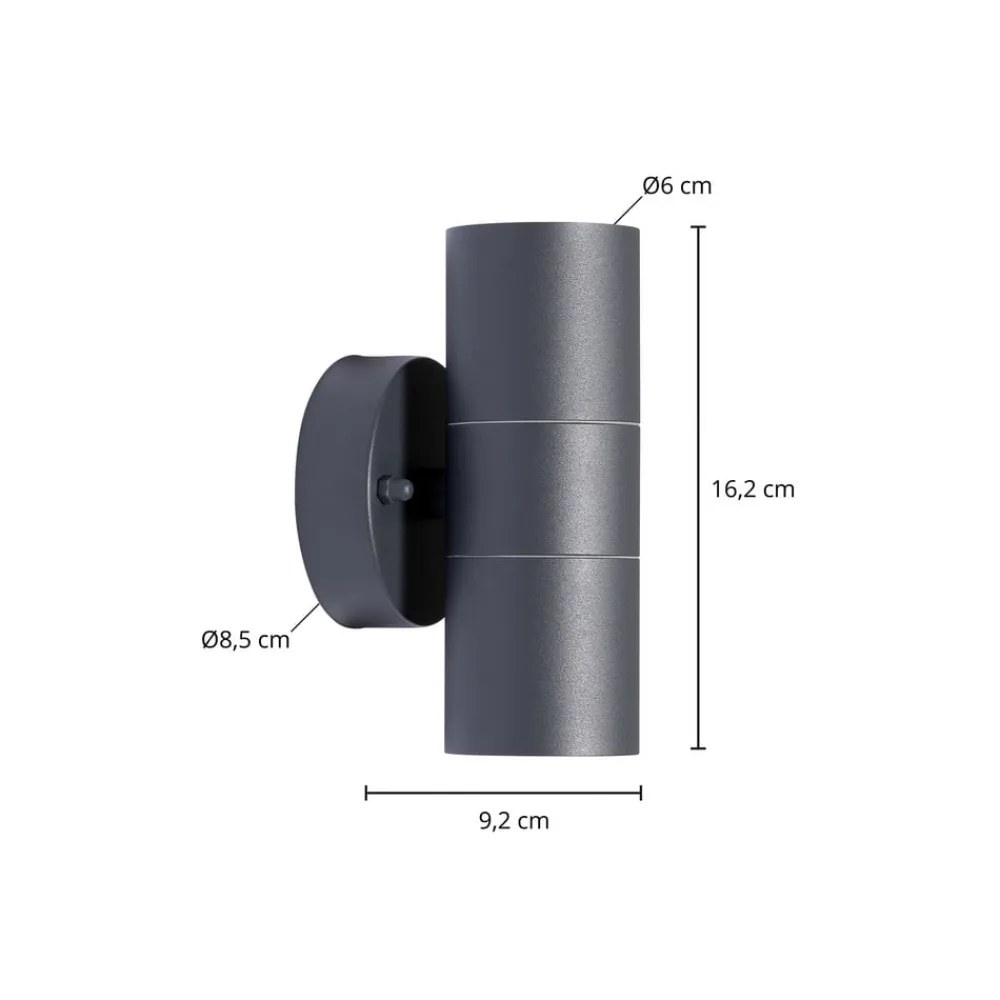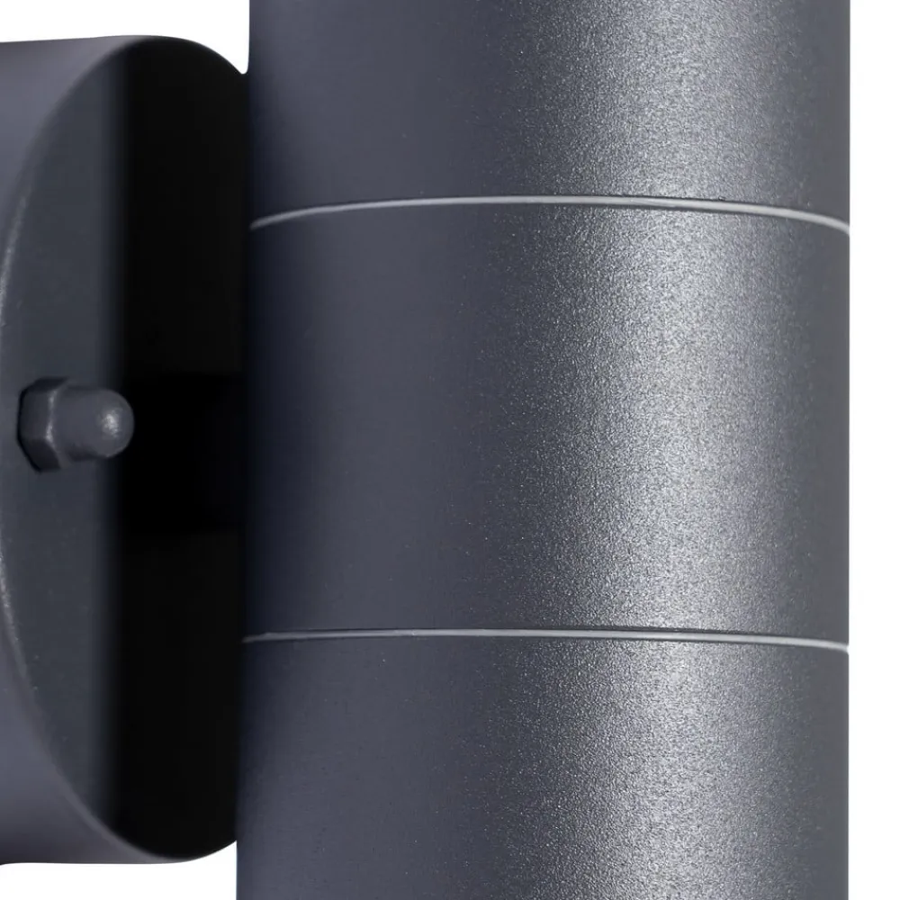 Moderne Tulimar udendørs væglampe med dobbelt stråleretning Tulimar udendørs væglampen kommer i en version med 2 lyskilder og imponerer med det samme med sit afrundede design. Den cylindriske lampeskærm af mørkegrå aluminium huser to lyspunkter, der sender lys opad og nedad langs væggen. Det skaber elegante lysaccenter på husmuren, og beskueren bliver ikke blændet – ideelt til brug ved husets indgang eller på terrassen. Den trendy mørkegrå farve harmonerer rigtig godt med moderne omgivelser.