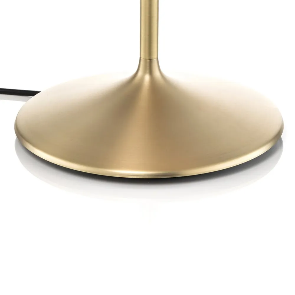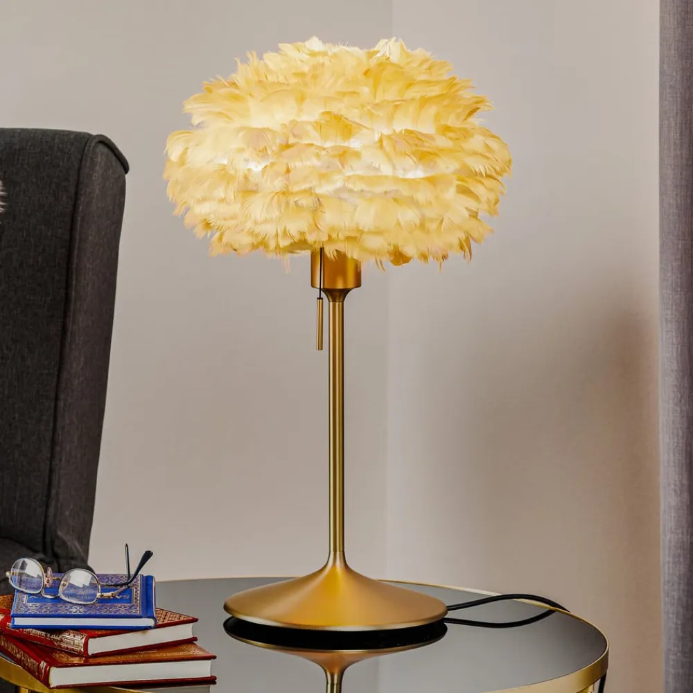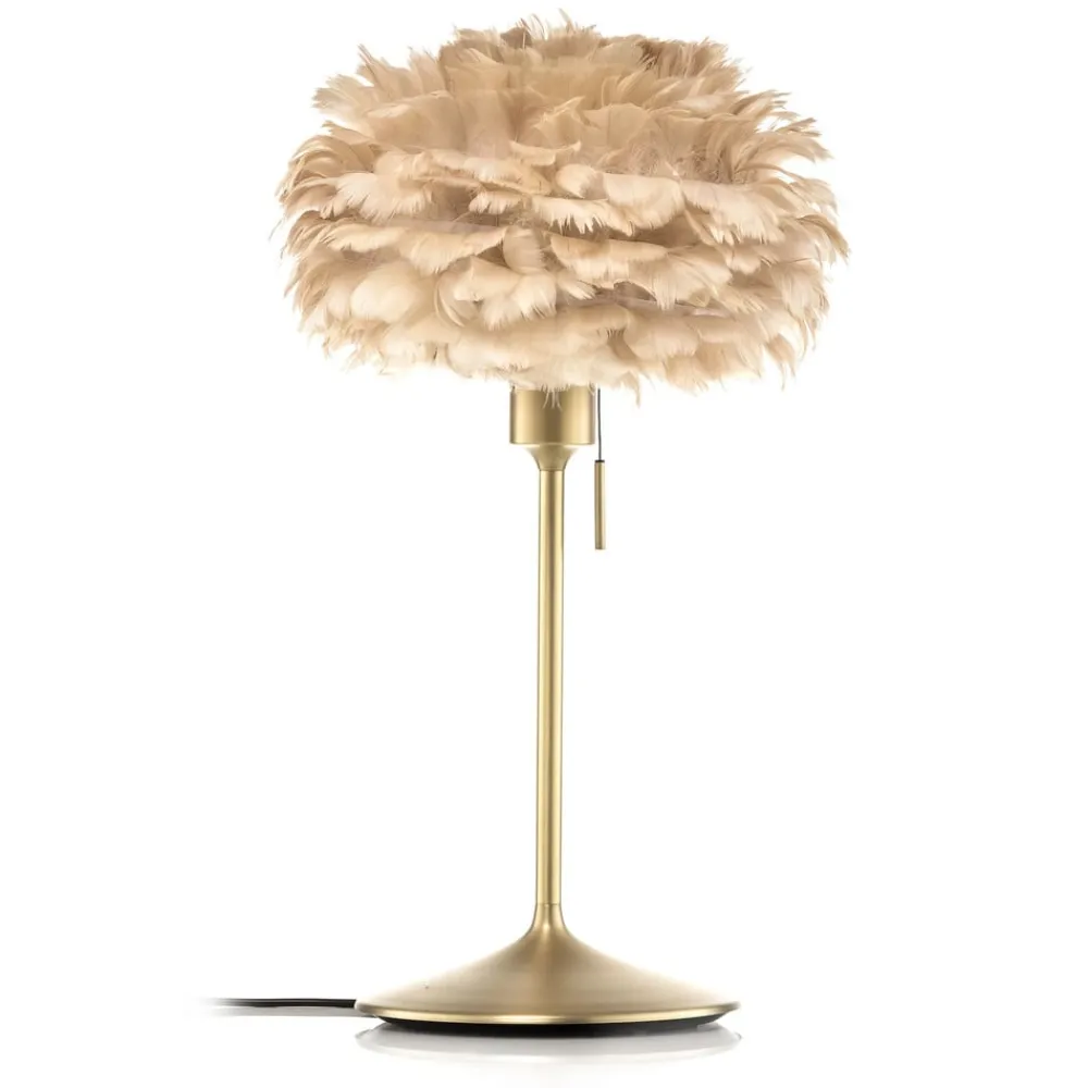 Bordlampe Eos mini med skærm i brun fjerkjole og stativ i messing