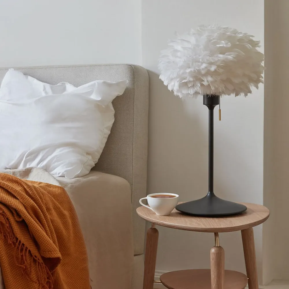 Bordlampe Eos mini – skærm lavet af fjer på sort stativ