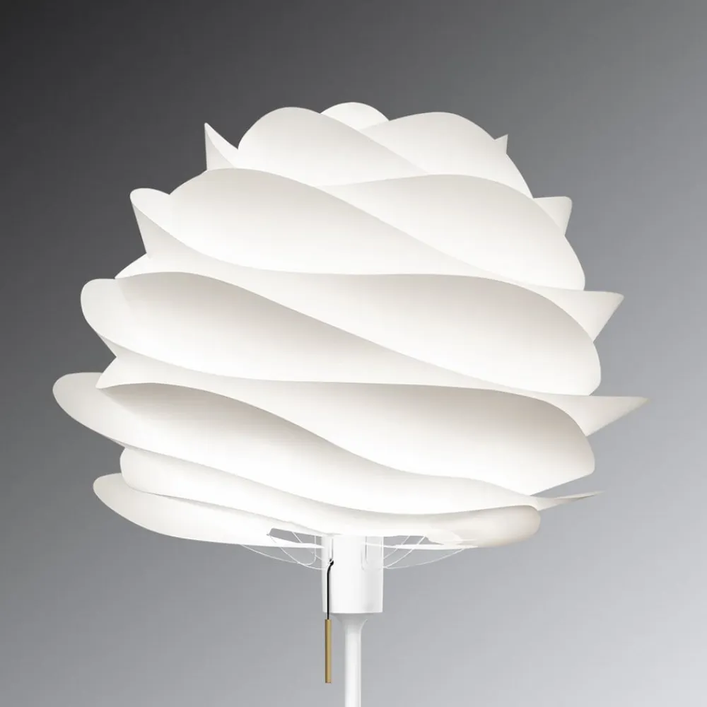 Carminas ubrydelige plastskærm, som fanger øjet med sin bløde bølgeform og den deraf følgende lyseffekt, suppleres af et hvidlakeret, slankt metalstel for at skabe en gulvlampe, der med sit design gør sig bemærket overalt.