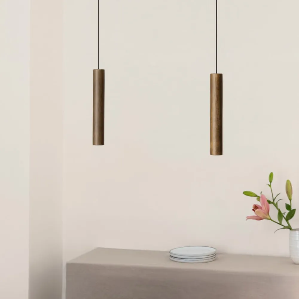 Den stavformede skærm på LED-hængelampen Chimes er fremstillet af ægte egetræ. Den tynde konstruktion på træskærmen skaber fokus på det udstrålende lys, lige som på et spotlight.