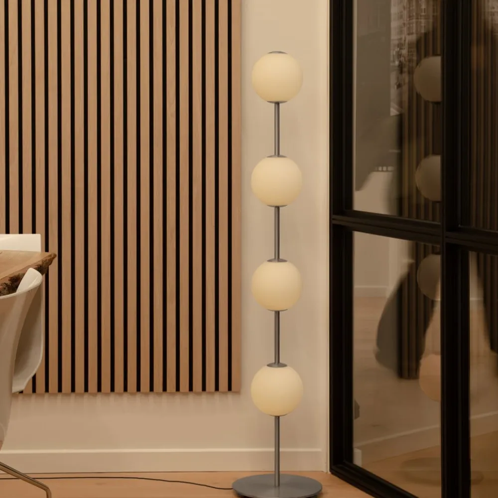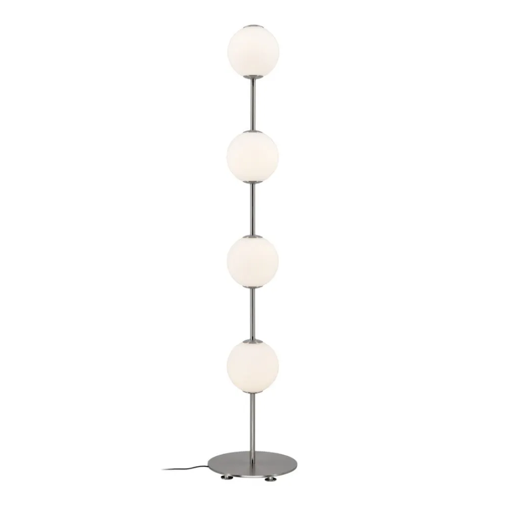 LED-gulvlampe Audrey i stålfinish med fire opalglaskugler, der lyser rundt om
