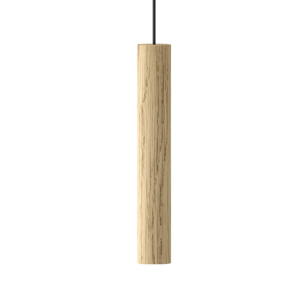 Den stavformede skærm på LED-hængelampen Chimes er fremstillet af ægte egetræ. Den tynde konstruktion på træskærmen skaber fokus på det udstrålende lys, lige som på et spotlight.