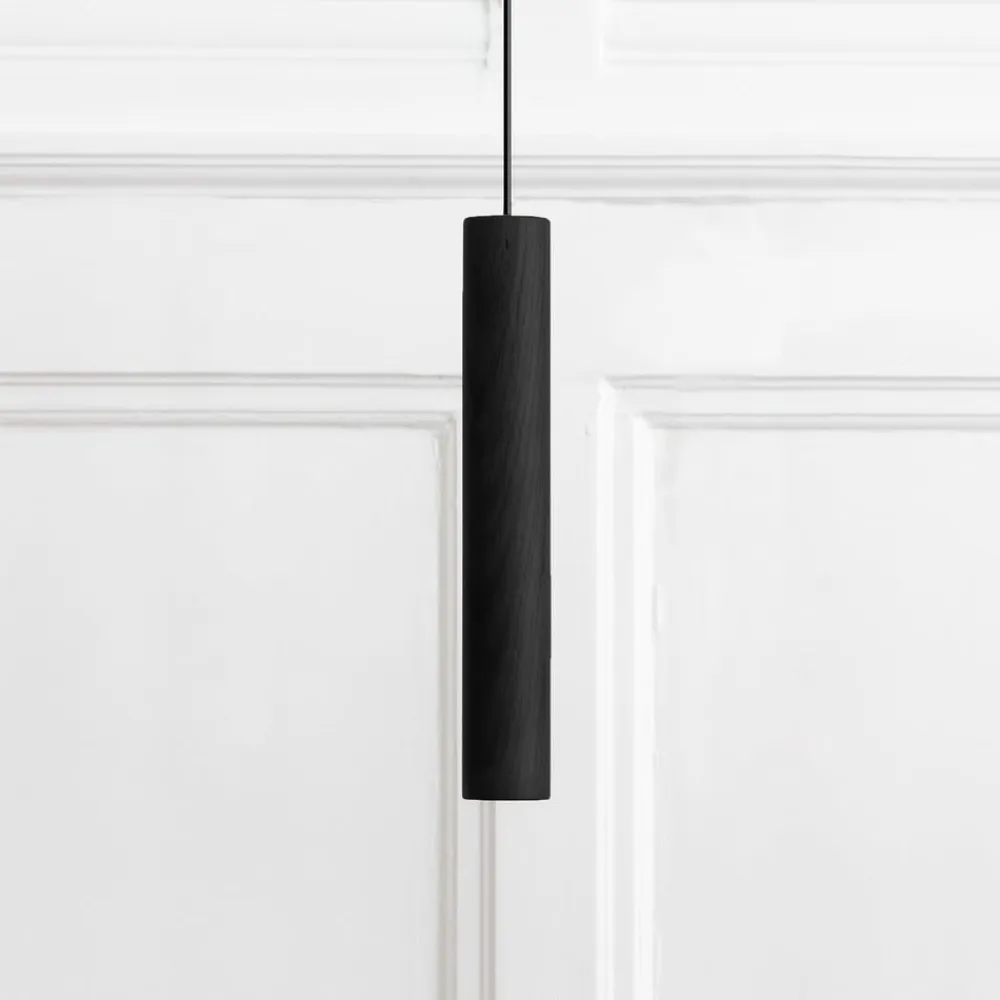 Den stavformede skærm på LED-hængelampen Chimes er fremstillet af ægte egetræ. Den tynde konstruktion på træskærmen skaber fokus på det udstrålende lys, lige som på et spotlight.