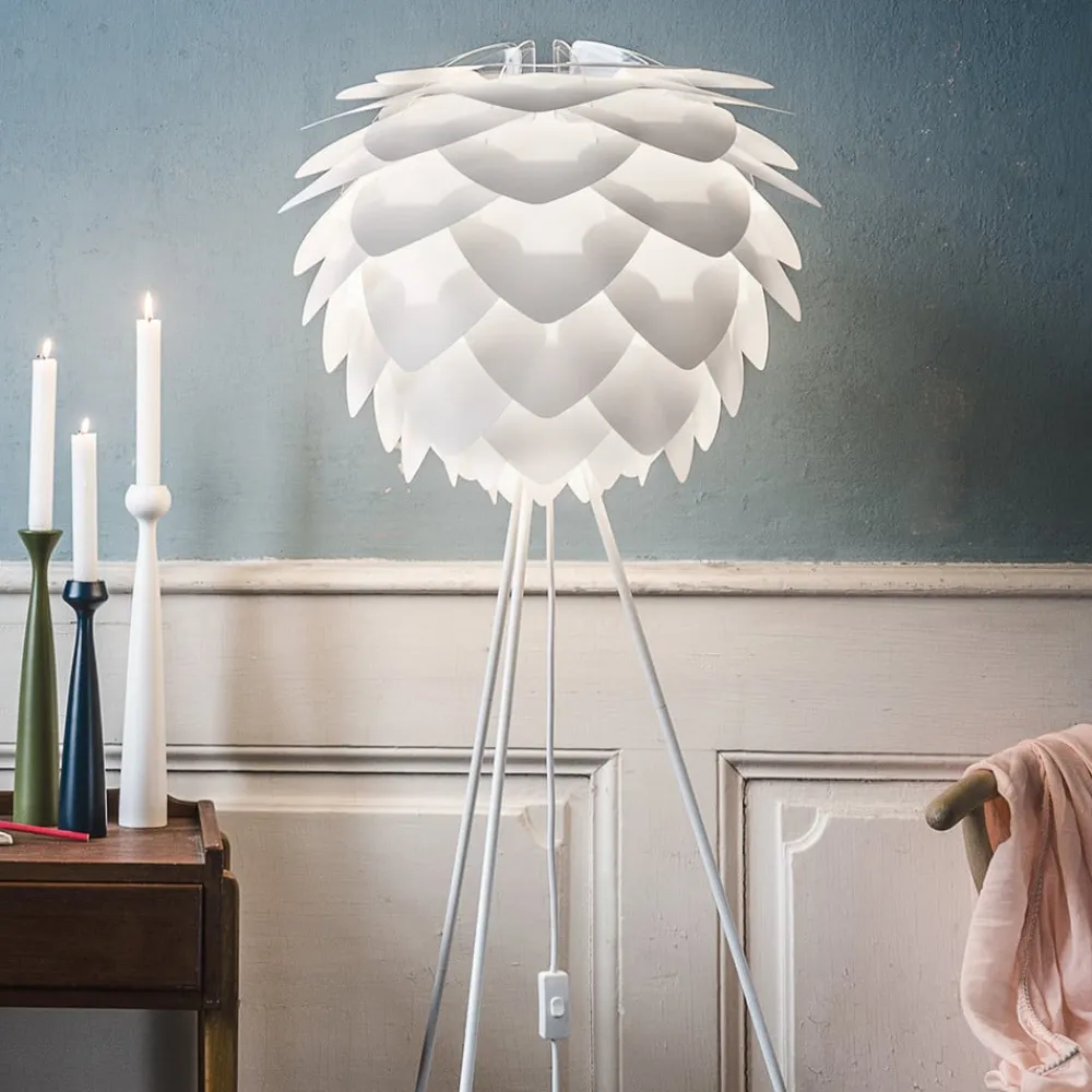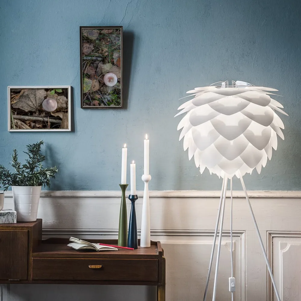 En meget dekorativ kombination, der stort set kan kombineres med enhver indretningsstil, det er standerlampen Silvia medium. Skærmen – et design fra Vita Design holdet – er her placeret på et trebenet stativ, der er skabt af Søren Ravn Christensen, den kreative udvikler og medstifter af den danske lampevirksomhed UMAGE.