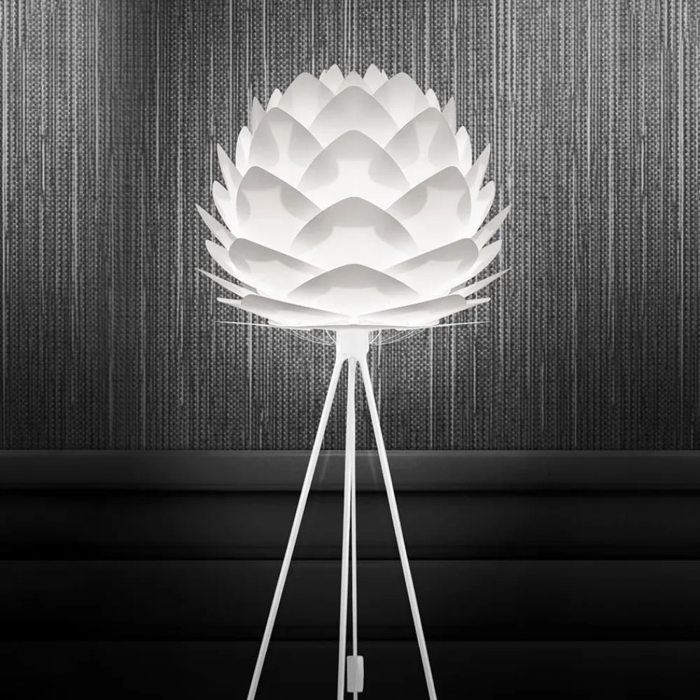 Den diskrete enkelhed i det hvidlakerede aluminiumsstel, står i stærk kontrast til lampeskærmens udseende. Skærmen er sammensat af hvide plastelementer, og takket være dens overlappende, trekantede blade fremstår den som et floralt element fra de sydlige lande. Når man tænder for lyset opstår der en accent omgivelsesbelysning til boligen. Med snorafbryder og 300 cm tekstilkabel.