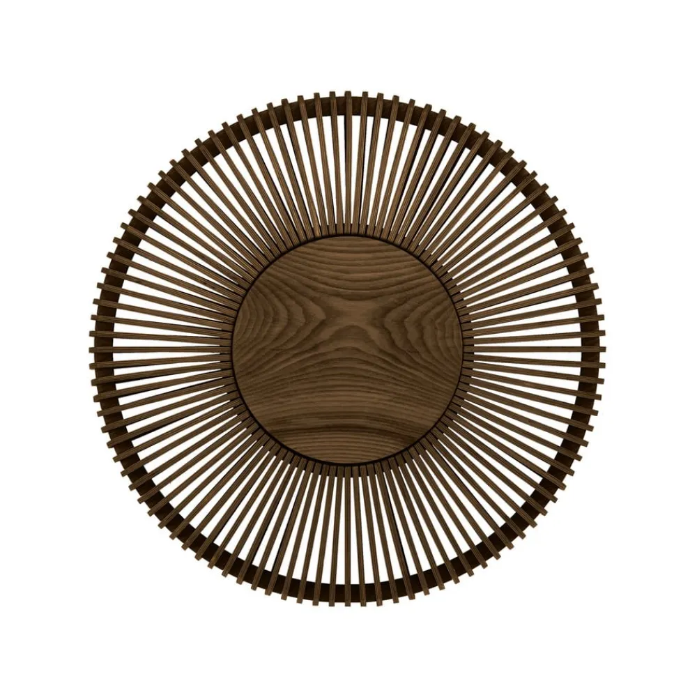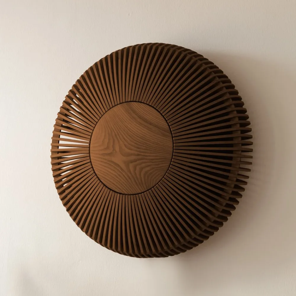 Skærmen på væglampen Clava består af mange laserskårne trælameller. Lyset kommer indefra og skinner på egetræsrammen. På denne måde genererer væglampen en smuk, strålende glød, der kan sammenlignes med solen, men oplyser væggen helt uden blænding.