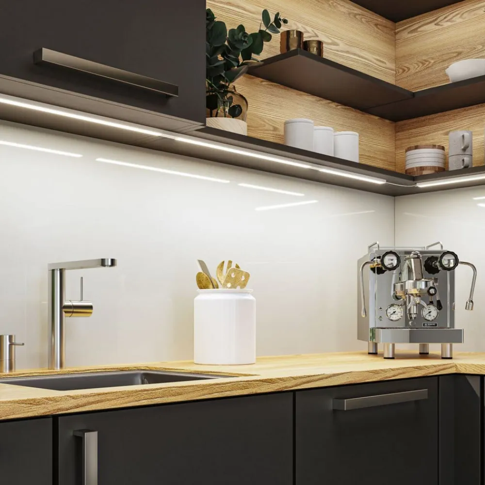Moderne køkkenbelysning med bevægelsesstyring – Inline LED-underskabslampe, startsæt med to varmhvide armaturer Inline LED-underskabslampen er designet til funktionel belysning af køkkenbordplader. Den består af en slank aluminiumsprofil og afskærmning med rengøringsvenlige overflader og indeholder varmhvide LED’er. Der er integreret en PIR-sensor til betjening, som muliggør berøringsfri betjening – praktisk og hygiejnisk. Skift sker med en strygende bevægelse, inline-dæmpning er mulig ved at holde hånden foran sensoren – Startsæt med to armaturer, tilslutningskabel med plug-in-strømforsyningsenhed, tilslutningskabel, monteringsmateriale – Kan suppleres med forlængersæt (op til en maksimal samlet effekt på 24 W) – PIR-sensoren på det første armatur bruges til at styre alle andre tilsluttede armaturer sammen – Hukommelsesfunktion gemmer dæmpningsindstillingen