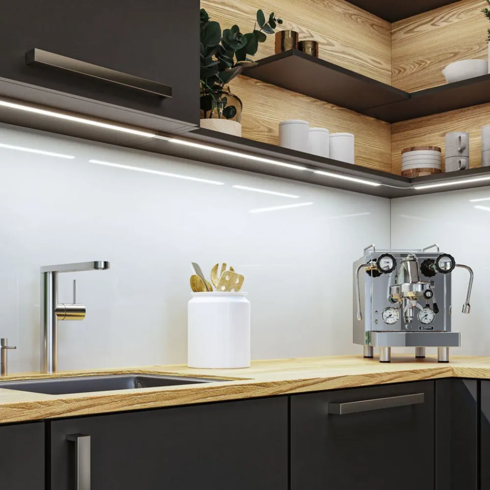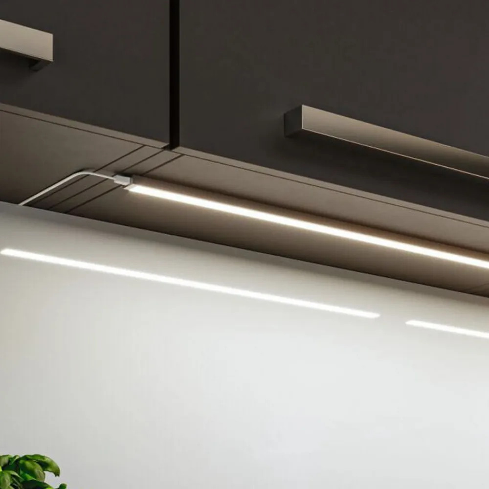 Moderne køkkenbelysning med bevægelsesstyring og justerbar lysfarve – LED underskabslampe Inline, startsæt med to lamper LED underskabslampen Inline er designet til funktionel belysning af køkkenets arbejdsflader. Den består af en slank aluminiumsprofil og en diffusor med overflader, der er nemme at rengøre. Der er integreret en PIR-sensor til betjening, så den kan betjenes berøringsfrit – praktisk og hygiejnisk. Lysfarven kan justeres fra varm hvid til dagslys ved blot at tørre sensoren af med hånden – Startsæt med to lamper, tilslutningskabel med plug-in-strømforsyningsenhed, tilslutningskabel, installationsmateriale – Kan suppleres med et forlængersæt (op til en maksimal samlet effekt på 24 W) – PIR-sensoren på den første lampe bruges til at styre alle andre tilsluttede lamper sammen – Hukommelsesfunktion gemmer den valgte lysfarve