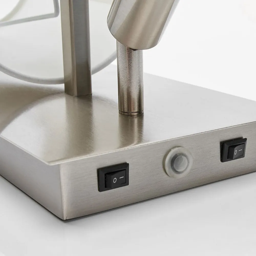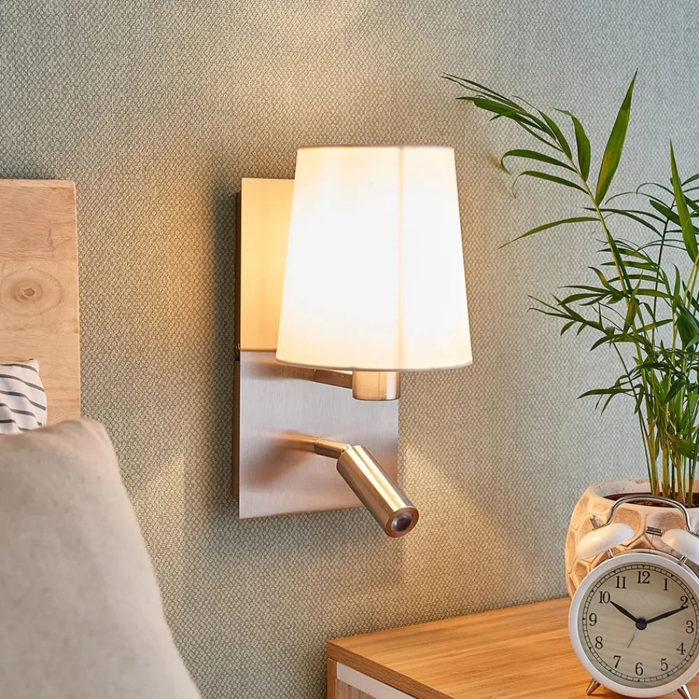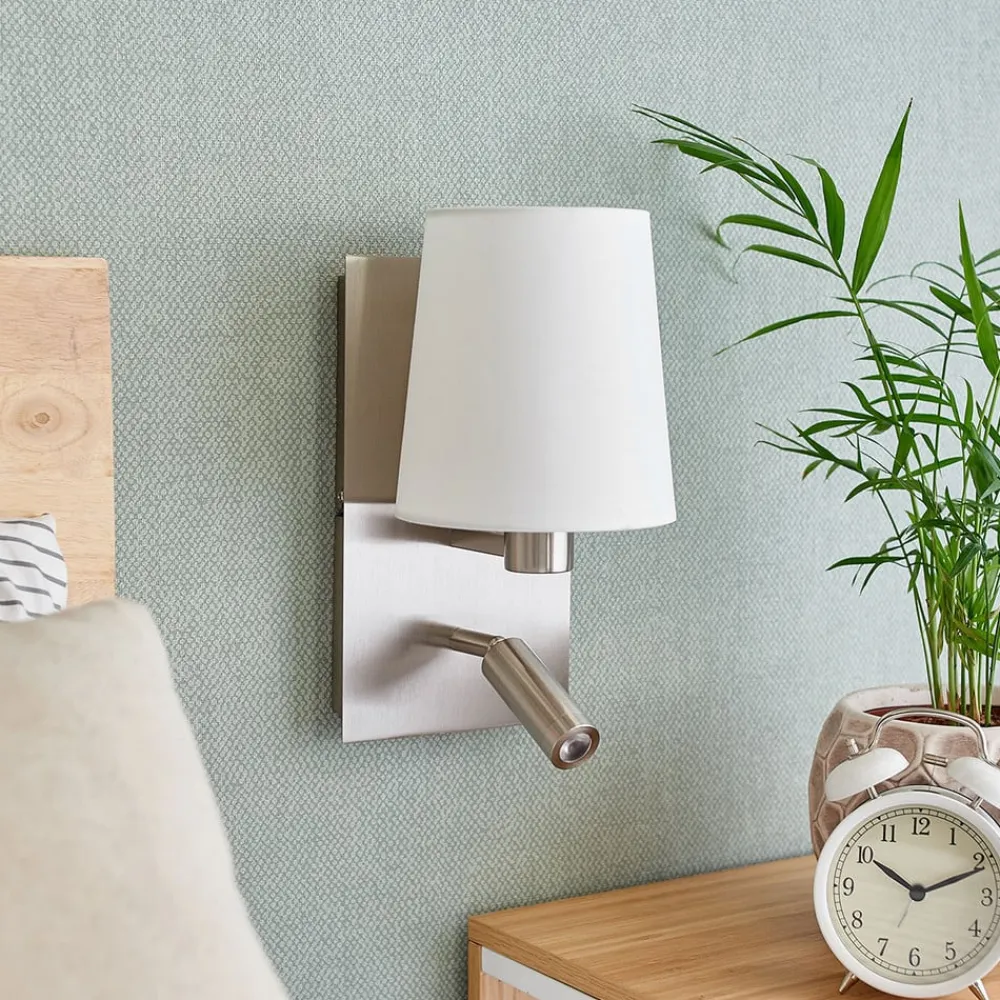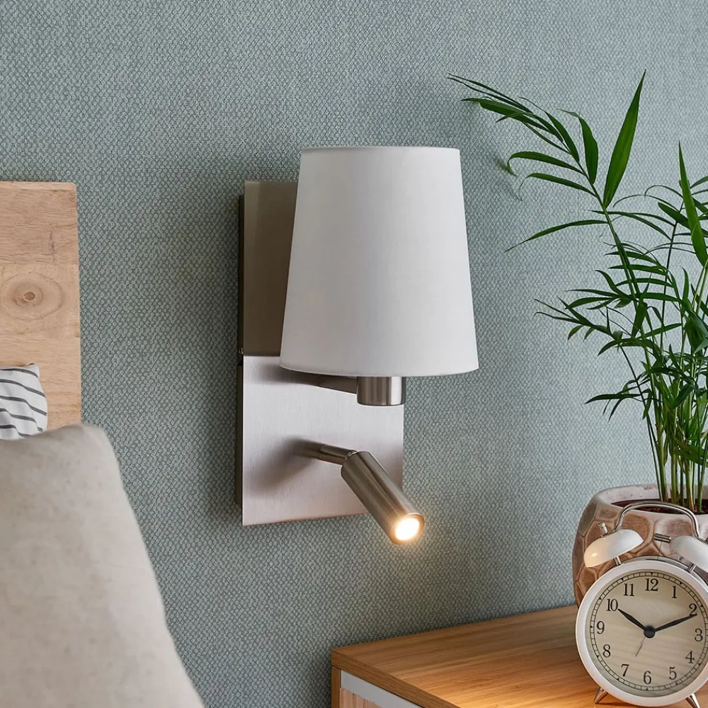 Væglampe Aiden med hvid stofskærm og integreret LED-læselampe Aiden er en væglampe, der passer perfekt i et soveværelse og kan installeres ved siden af en seng. Alternativt kan den monteres inden for rækkevidde af en sofa. Væglampen er en meget nyttig kombination af stofskærm og bevægelig læselampe. Stofskærmen er hvid og giver et smukt, hyggeligt lys, når man læner sig tilbage og slapper af. Den anden lyskilde er en cylindrisk, kompakt LED-læselampe, der kan drejes og svinges efter behov og giver en målrettet, punktvis belysning, der er ideel til læsning om aftenen. De to lyskilder kan betjenes separat, og kontakterne er placeret i vægbeslagets nederste del. Læselampe: – varmhvid (3.000 K) – 210 lumen