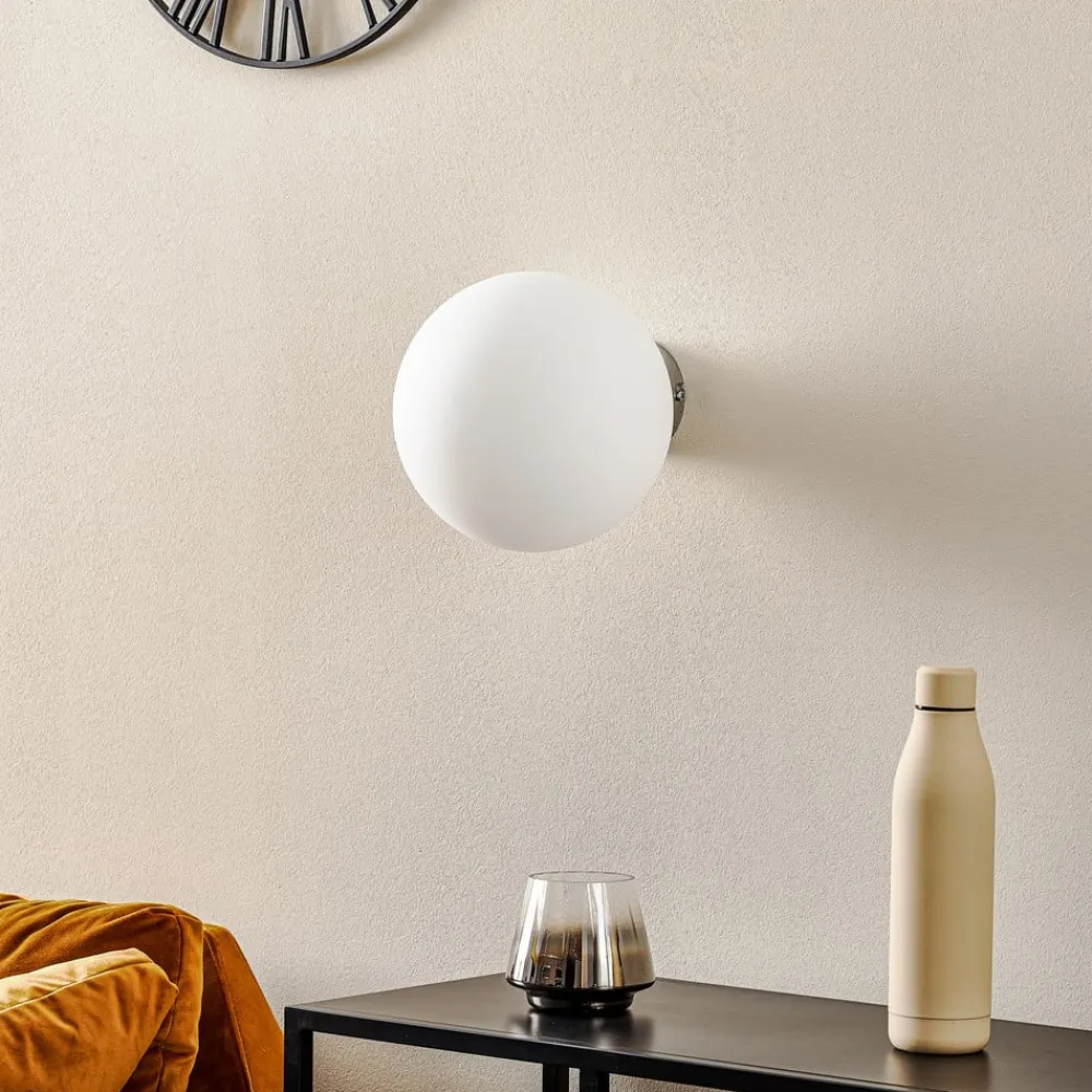 Væglampe Dione imponerer med sit moderne design og kombinationen af højkvalitets metal og frostet glas. Denne lampe passer perfekt ind i forskellige boligområder som stuen, entreen, soveværelset og spisestuen og giver ethvert rum et stilfuldt præg. Den kromfarvede vægbeslag harmonerer perfekt med det hvide frostede glas og sikrer et elegant look.