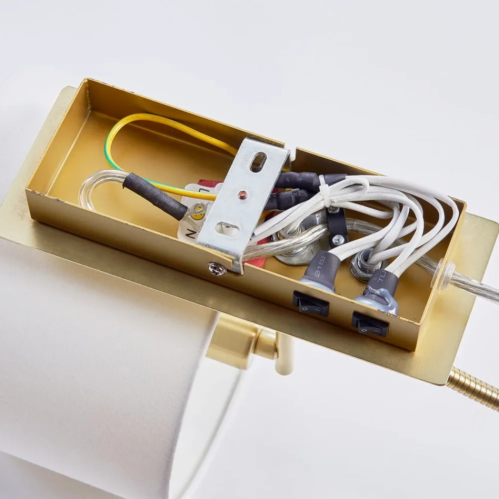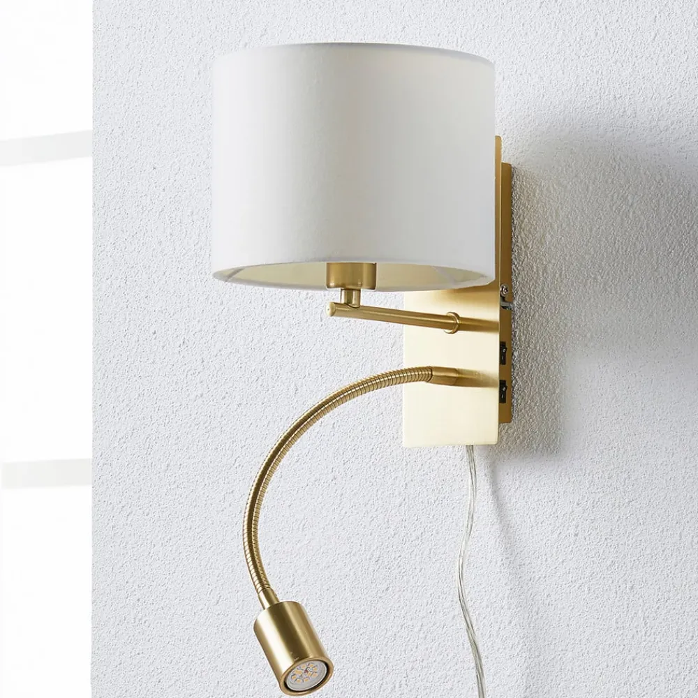 Hvid Florens væglampe med stofskærm, messingfarvet stel og LED-læselampe Ved første øjekast kan man se, at Florens væglampen så at sige kombinerer to lyskilder under ét tag. På den ene side er der den runde stofskærm med en hvid nuance, som giver et hyggeligt opholdslys, og på den anden side giver den fleksible LED-læselampe et målrettet lys, som er meget nyttigt til læsning eller andre aktiviteter. Væglampen med de to forskellige lyskilder er derfor ideel at placere over en seng eller i nærheden af sofaen, da det er her, man har mest gavn af den. I den forbindelse er det også nyttigt, at der er to separate afbrydere på rammen, så den er nem at bruge. Florens væglampen installeres og betjenes ved at tilslutte det 180 cm lange forsyningskabel, som er udstyret med et stik.
