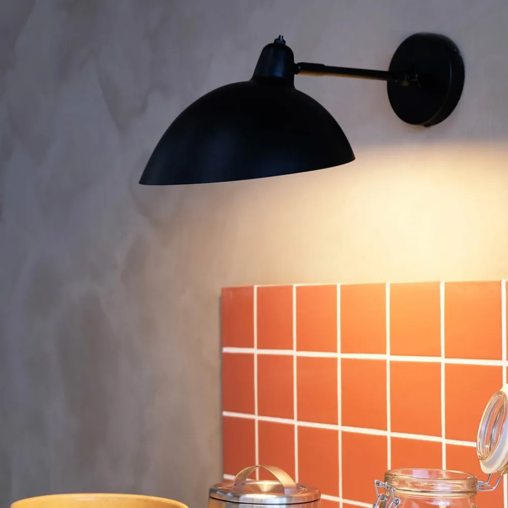 Futura væglampe med drejelig lampearm Futura væglampen med den brede, drejelige arm passer ind i mange indretningsstile takket være den neutrale sorte farve. Ideel som læselampe på væggen over sofaen eller over sengen. Nem at betjene med en kontakt på lampehovedet.