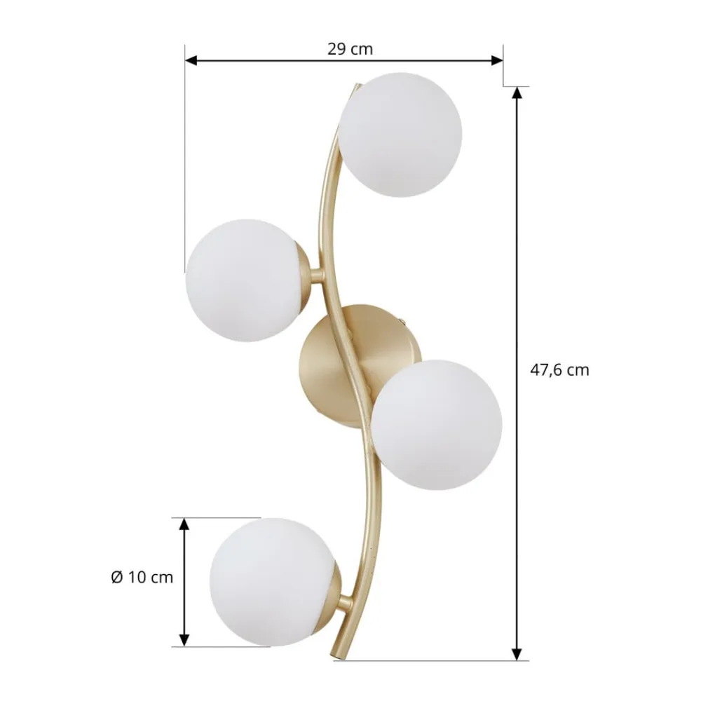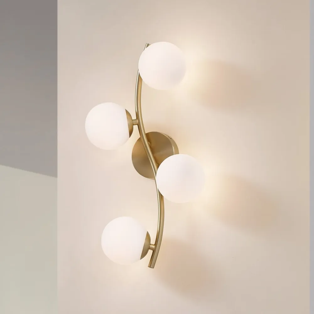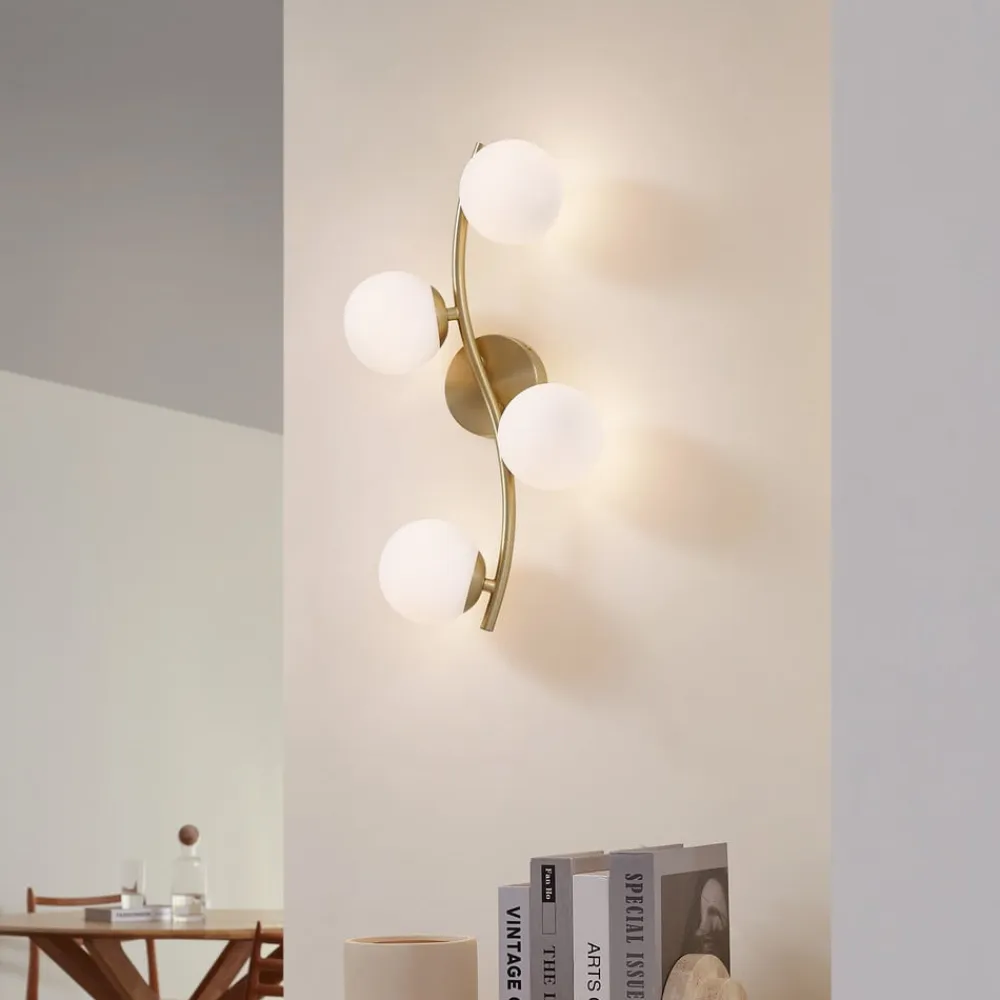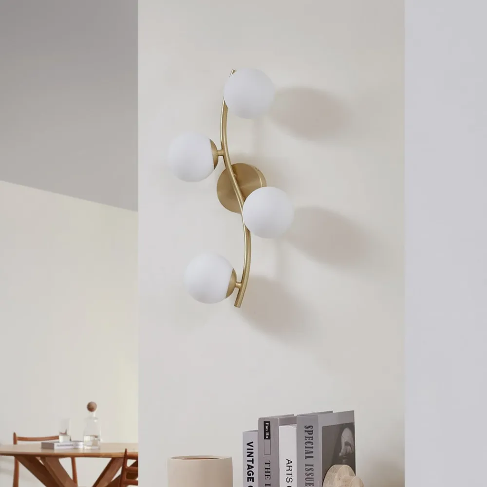 Væglampe Josiana forener moderne design med materialer af høj kvalitet som glas og metal. Kombinationen af opal hvidt glas og messingfarvet stel giver ethvert rum en tidløs elegance. Denne lampe er ideel til stuer og spisestuer og passer perfekt ind i forskellige indretningsstilarter.