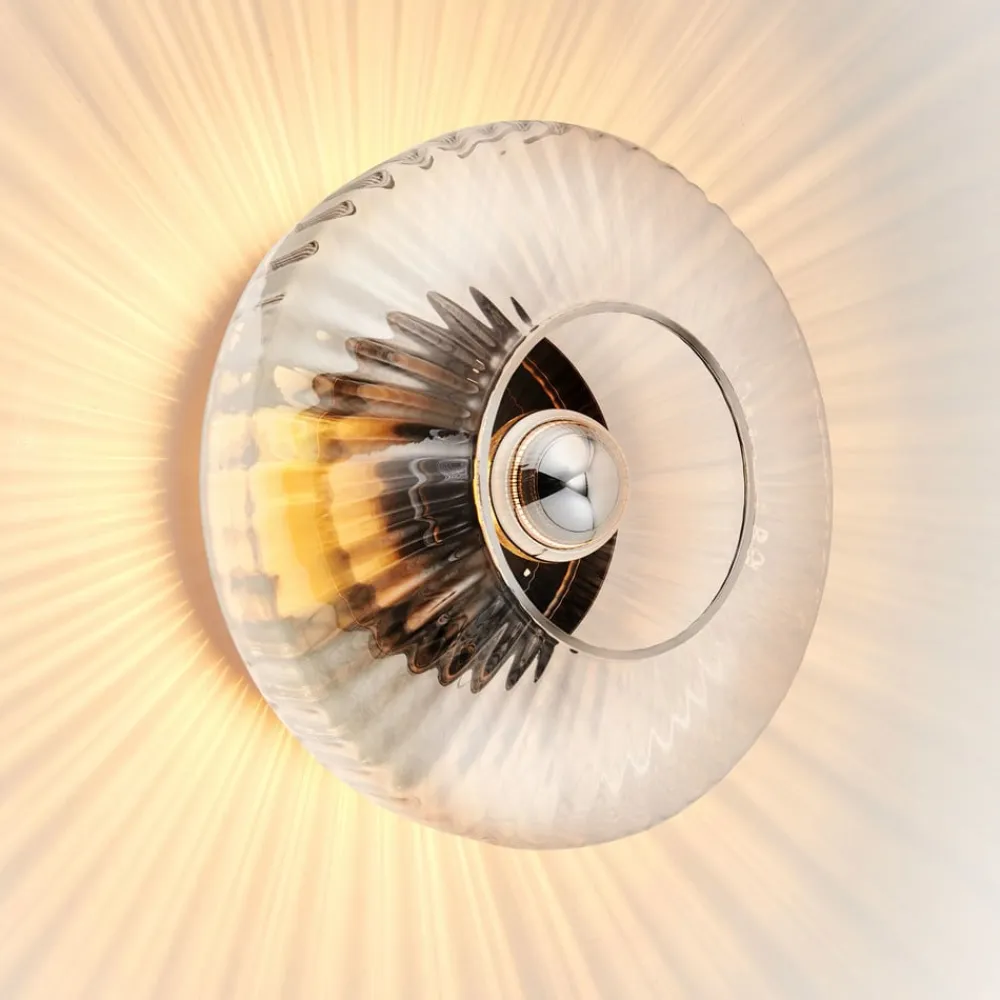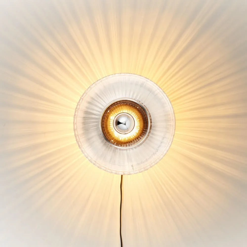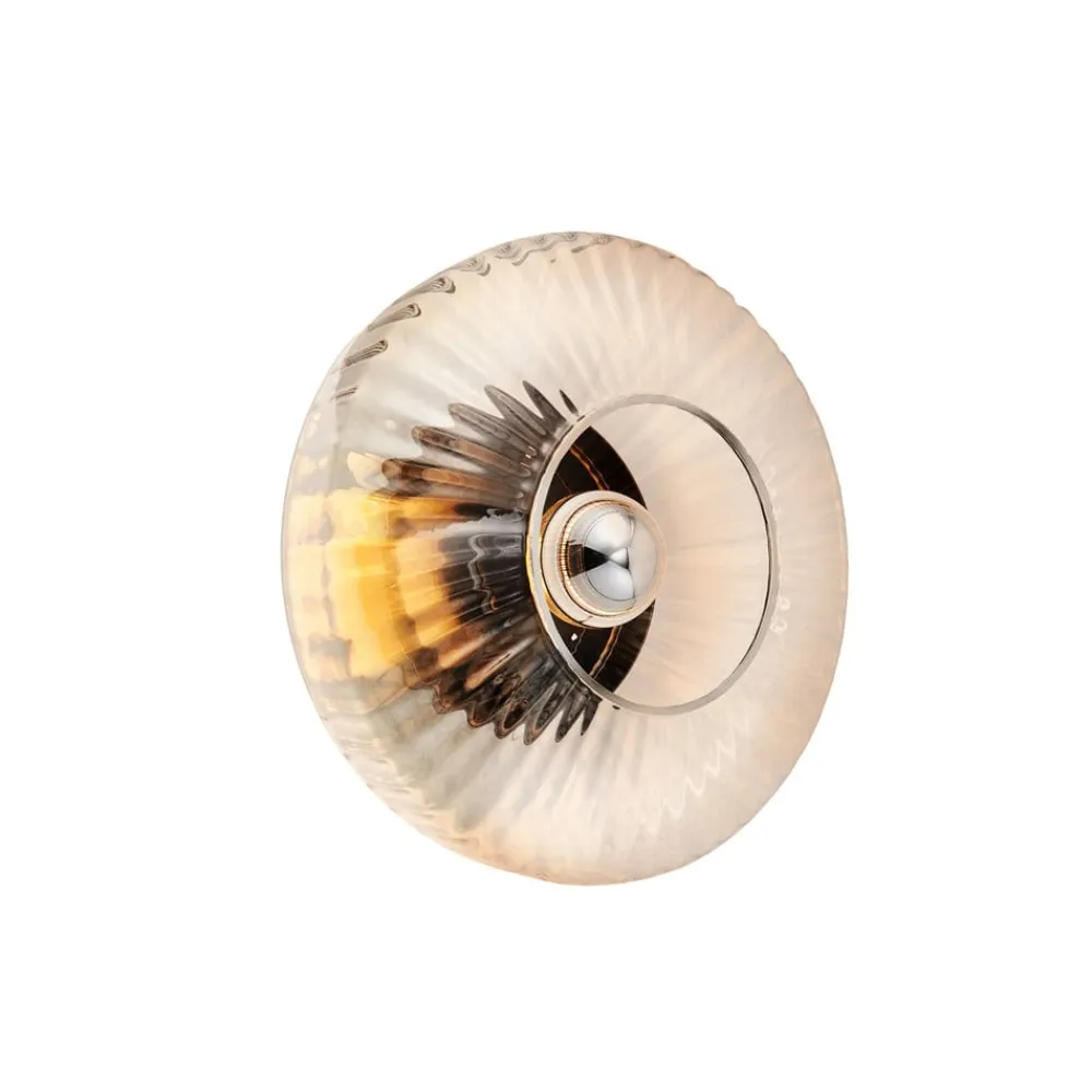 Øjeindsats medfølger: New Wave Optic XL-væglampe i bølget, mundblæst glas med stik New Wave Optic XL-væglampen er et ikonisk smykke til ethvert hjem. Den kaster et smukt lys på væggen takket være det bølgede, mundblæste glas. Den er også udstyret med stik og afbryder (tænd/sluk) på kablet, så der ikke er behov for vægtilslutning. New Wave Optic XL afrundes af øjeæbleindsatsen, som allerede er inkluderet i denne serie og er meget nem at indsætte. Stikket til en E27-lyskilde (medfølger ikke) er placeret i midten af armaturet. Til versionerne i røggrå, hvid og med klart glas anbefales en lyskilde med en sølvreflektor (se tilbehør). Til de rosa og ravfarvede versioner bør man derimod vælge en lyskilde med guldfarvet reflektor. Den fås også separat som tilbehør, uanset hvilken farvekombination du vælger: New Wave Optic XL er et universelt blikfang i dine egne fire vægge og er også forudbestemt som et ægte designobjekt til brug i hotel- og restaurationsbranchen. Bemærk: Leveres uden den viste lyskilde, se tilbehør.