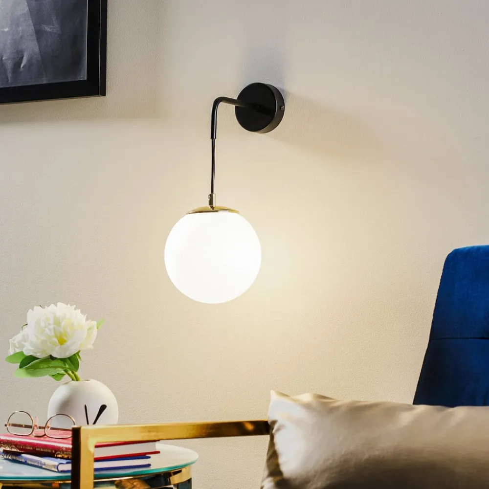 Væglampe Ognis K1 kombinerer moderne design med materialer af høj kvalitet som metal og glas for at skabe en stilfuld atmosfære. Kombinationen af sort og guldfinish giver ethvert rum et elegant touch og gør lampen til et ægte blikfang. Den kugleformede skærm sikrer en jævn lysfordeling og sætter målrettede accenter i stuen, soveværelset eller spisestuen.