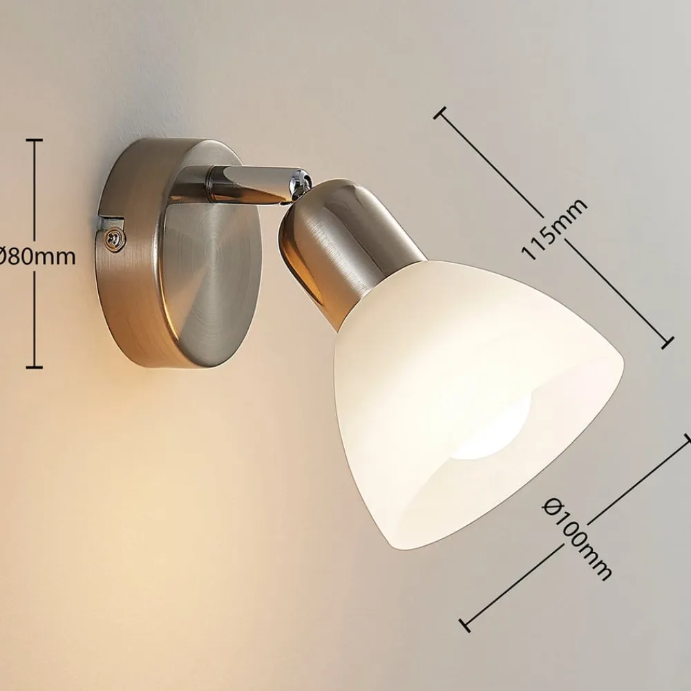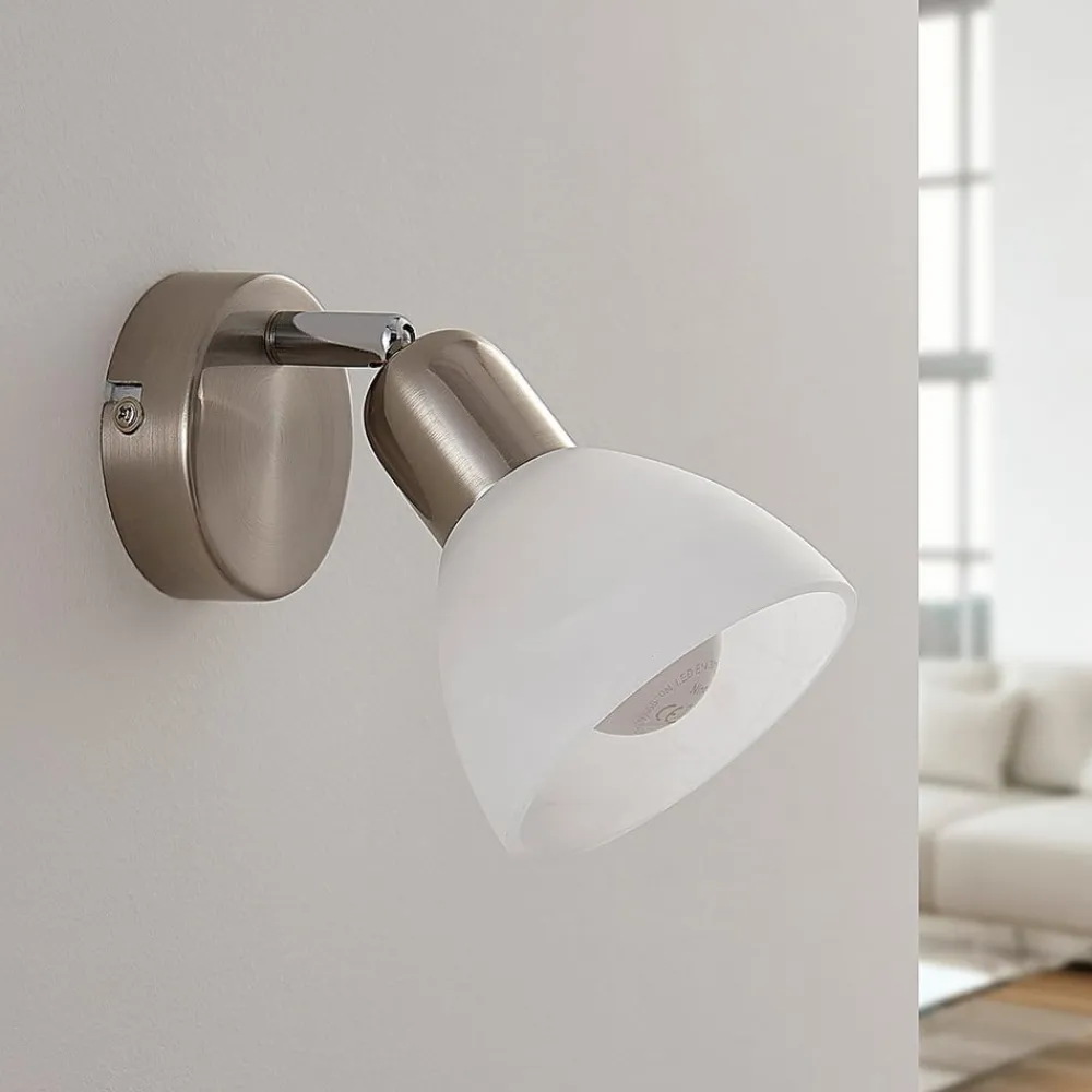 paulina væglampe med elegant glasskærm Paulina er en væglampe, der er designet som en spotlight. Skærmen er forbundet med vægbeslaget via et led, så den kan drejes og svinges. Hvis det er nødvendigt, anbefales det også at montere den i loftet. Den kugleformede hvide skærm har en elegant alabastfarvet nuance, så man kan se blide tågeslør passere gennem glasset. Glasset skaber også en blød lysfordeling og dermed en mere hyggelig atmosfære.