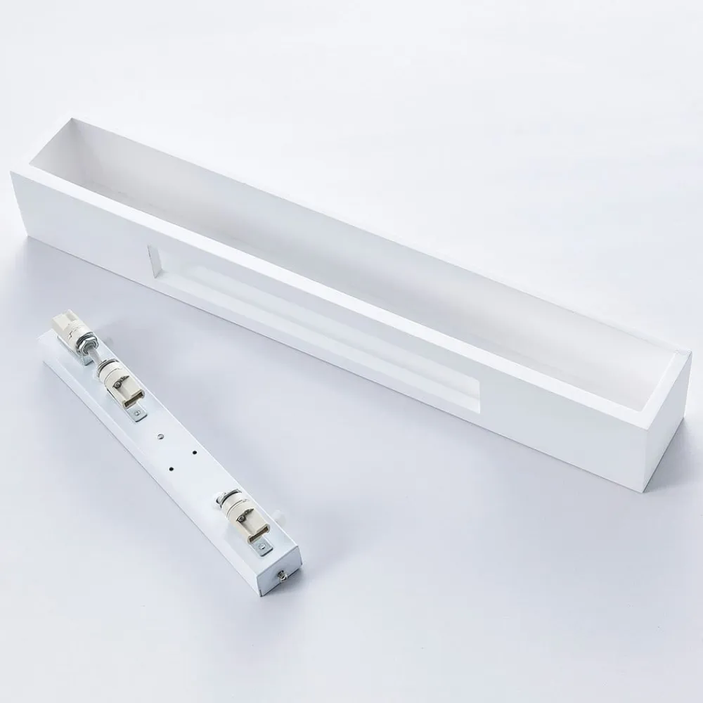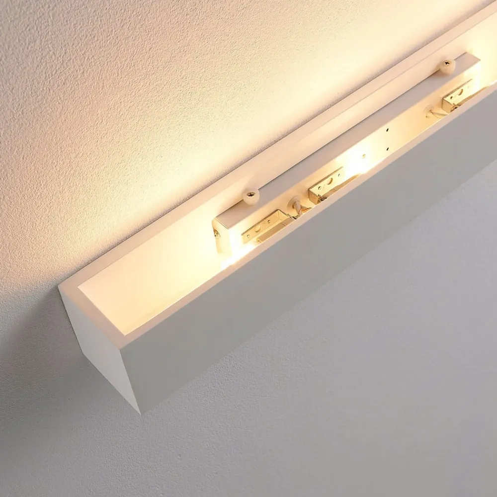 Langstrakt Santino LED-gipswallwasher med kantet lampekrop Takket være den opadgående lysemission skaber denne LED-gipswallwasher et vidunderligt hyggeligt lys, der er perfekt til stemningsfuld belysning af opholdsrum. Den kantede lampekrop i en aflang form er designet i en detaljeret og puristisk stil, der gør den både moderne og tidløs. Hvis du primært er på udkig efter et armatur til væggen, der kan skiftes i alle farver, er Santino et meget nyttigt belysningsobjekt, da gipsoverfladen på uplight væglampen kan males.