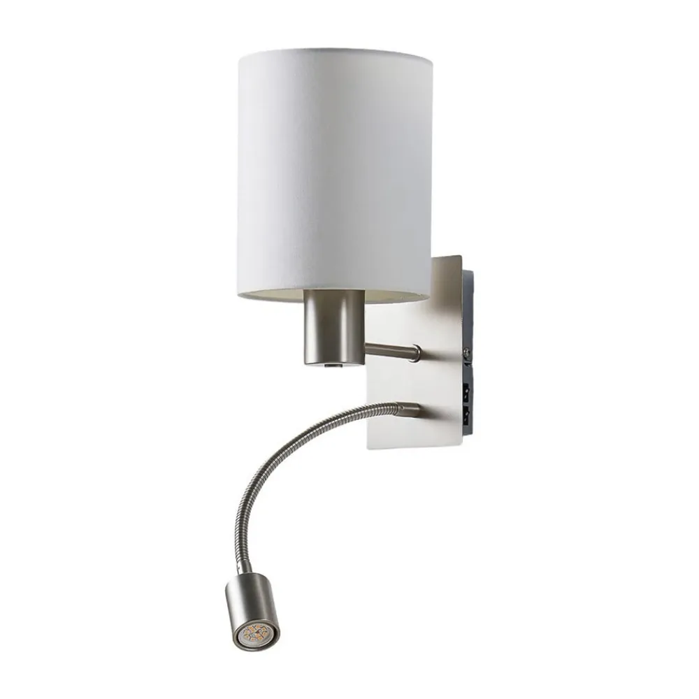Hvid stofvæglampe Shajan med integreret, fleksibel LED-læselampe Shajan-væglampens udseende domineres af den cylindriske lampeskærm af hvidt stof. Bag den sidder en E27-fatning, som kan udstyres med en lyskilde efter eget valg. Ud over denne lyskilde, som giver et smukt, særligt stemningsfuldt feel-good-lys, er der en fleksibel arm på rammen, som fører til den integrerede LED-læselampe. Takket være flexteknologien kan det lille spotlight justeres uden huller, så lyset skinner præcis, hvor der er brug for det. For ekstra bekvemmelighed er de to kontakter placeret direkte på stellet, og denne funktion gør Shajan ideel som belysningsmulighed til sofaen eller sengen.