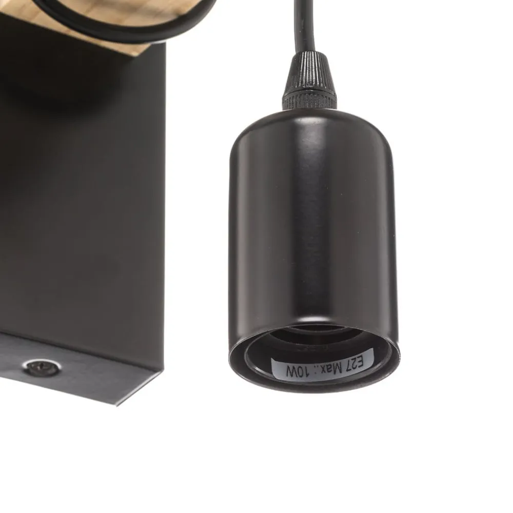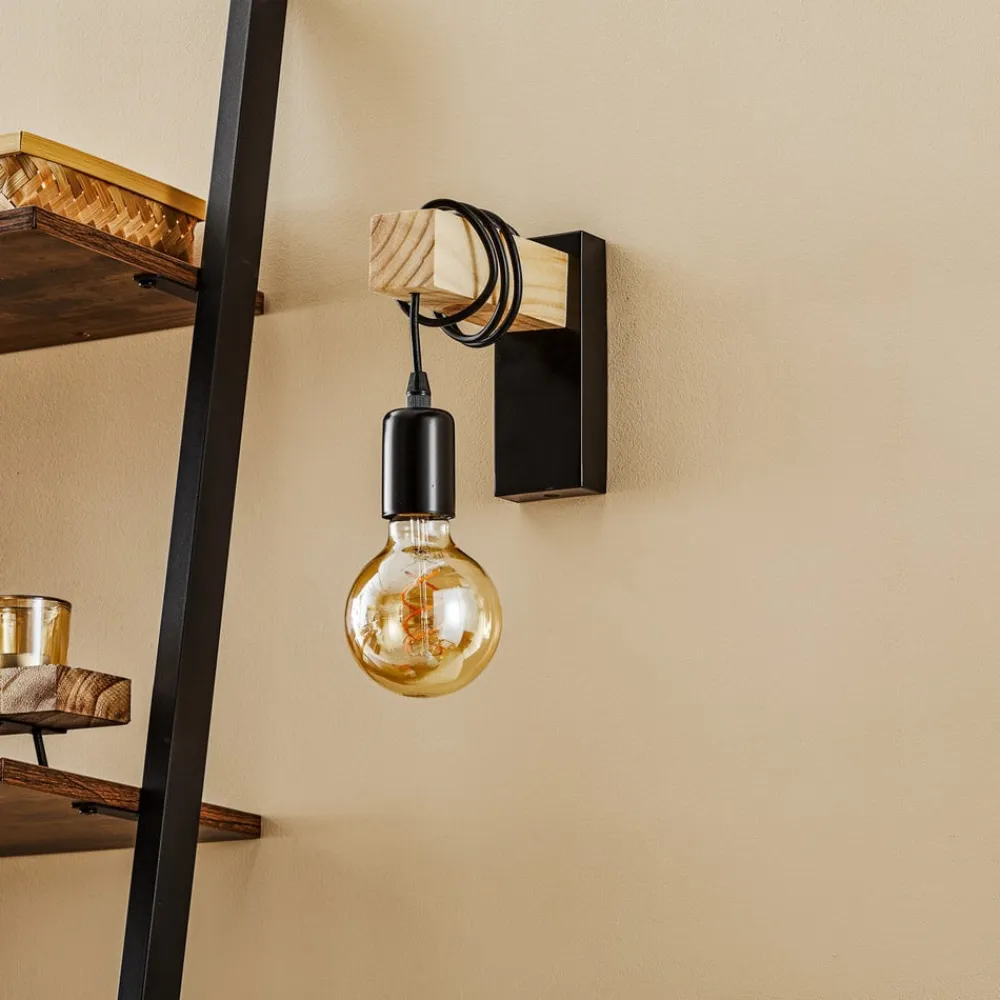 Væglampen monteres med en sort holder på væggen. Vandret stikker en træstump ud i rummet, hvor det ligeledes sorte kabel er viklet rundt om, som pæren hænger i. Naturlighed og industriel charme forener sig der i den formfuldendte lampe, der er ideel at integrere i talrige indretningsstile. Som lyskilde ved siden af sengen kommer lampen her særligt godt til sin ret.
