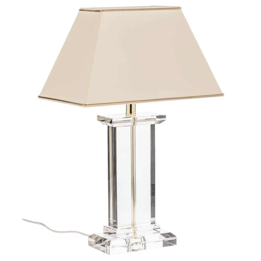 Den cremefarvede Veronique Chintz bordlampe og K9 krystalglas kombineres meget elegant og skaber en speciel iøjnefaldende.Lampens bund ser meget robust ud takket være det brede, kantede K9-krystalglas og minder om en stabil søjle. Tænding af lampen lader endda glasbasen skinne lidt, en særlig flot bivirkning, der ser meget yndefuld ud på grund af det skårne K9-krystalglas. Skyggen er derimod raffineret øverst og nederst med vaffeltynde, gyldne dekorative kanter. Lyset kan let tændes ved hjælp af en kontakt på forsyningsledningen. En varmhvid lyskilde, som frit kan vælges, kan også skabe en hyggelig atmosfære.