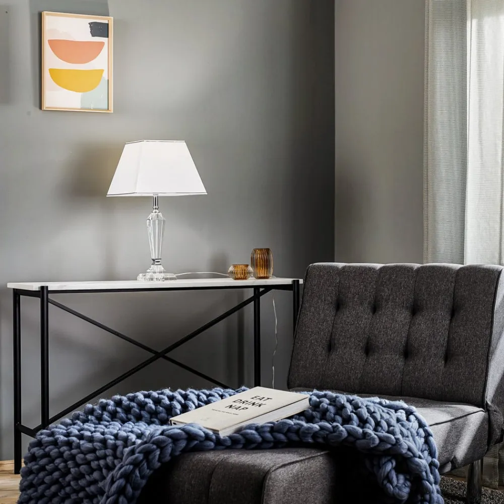 Veronique bordlampe er udstyret med en hvid chintz-skærm, der forstærkes af fine sølvkabler i øverste og nederste kant. Designet kombinerer den enkle stofskærm med en stearinlyslignende base lavet af fint, skåret K9-krystalglas, der er raffineret med to kromfarvede metalstykker. Ved at aktivere lampen er selv krystalbasen lavet til at lyse lidt, hvilket helt sikkert gør denne lampe til en iøjnefaldende. Varmhvid, behageligt lys anbefales til den frit valgbare lyskilde. Afbryderen er på forsyningslinjen.