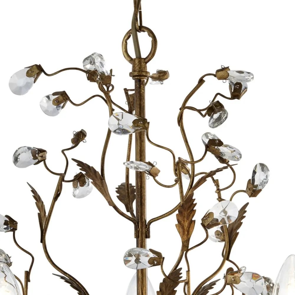 Denne pompøse lysekrone med navnet Almandite er umiskendeligt indordnet under den florentinske stil, dvs. lamper med en tydelig forbindelse til blomster, for til lampens udformning hører der sig fine, snørklede udstikkere, som minder meget om klatreplanter. De er smykket med krystaller, som man kan forbinde med knopper. De fem pærer, som er jævnt fordelt på lampen, ser ud som stearinlys og understreger på den måde den fornemme og klassiske karakter af lysekronen. Hele konstruktionen er fastgjort til et kædeophæng. Den brunt-gyldne lakering funkler imponerende, når lampen tændes. Dette pragtstykke er fremstillet af metal og krystal. Meget pragtfuld og samtidigt utroligt effektfuld – det er lysekronen Almandite.