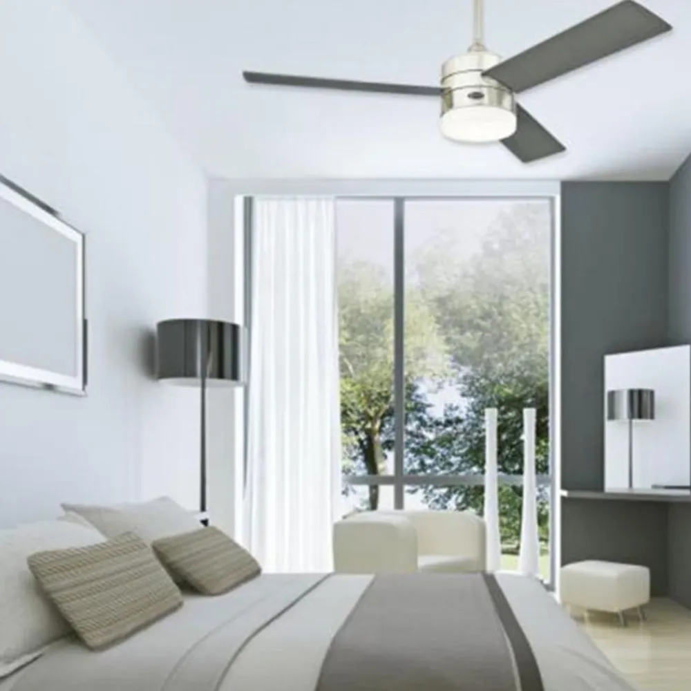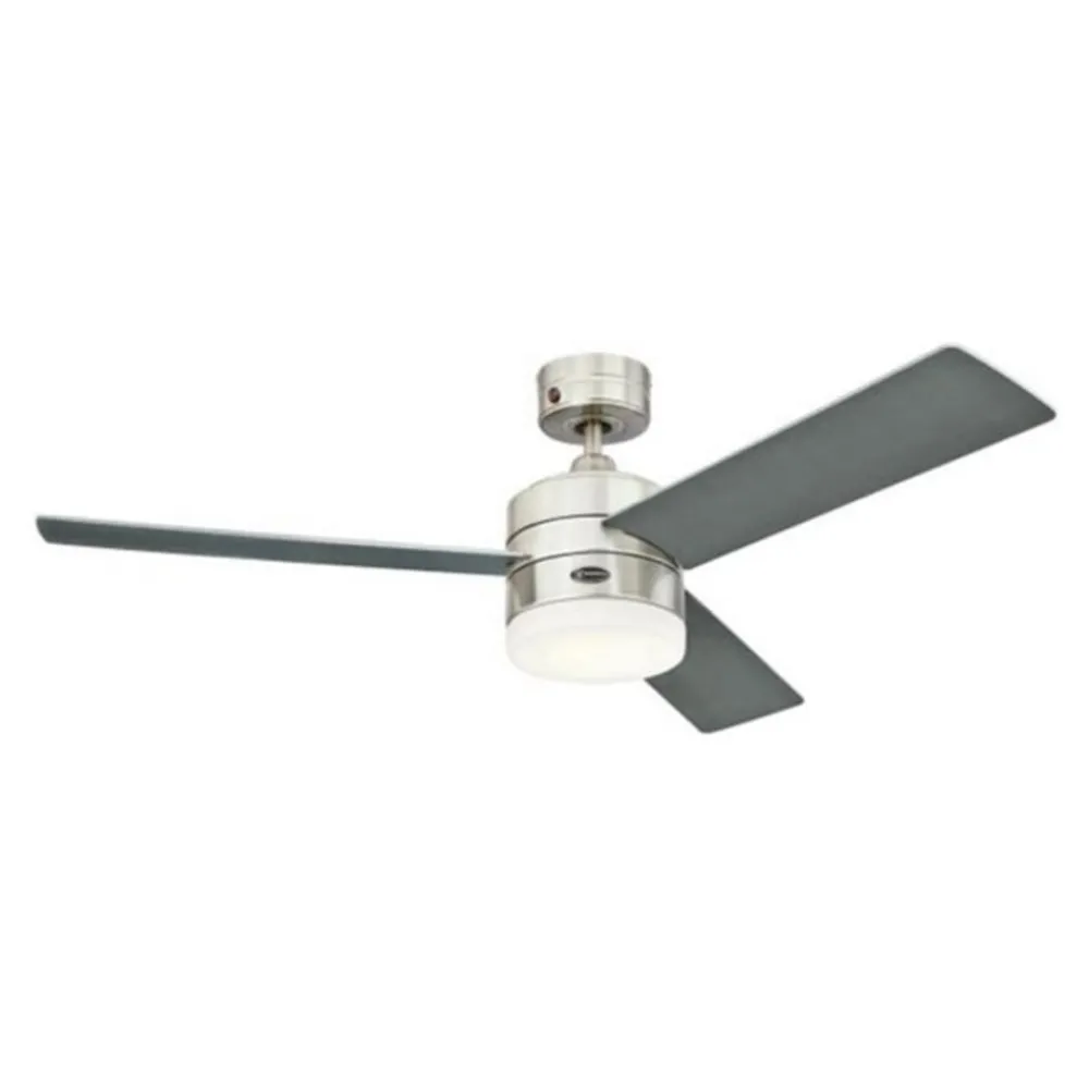 Loftventilatoren Alta Vista har et klart og struktureret design med rustfrit stålhus og tofarvede vinger. Den ene side er i grafitfarve, mens den anden side er i en lys ahornfarve. Den centralt placerede glaslampe er udstyret med en energieffektiv, dæmpbar LED-pære. En fjernbetjening til komfortabel betjening medfølger.
