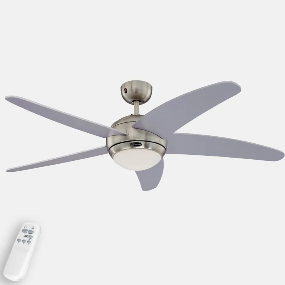 Den elegante loftventilator Bendan har afrundede vinger i moderne sølv. Under det opalhvide mælkeagtige glas sørger en halogenpære for behageligt lys. Fjernbetjening til ventilator og belysning samt pærer medfølger. Der kan tilvælges en vægafbryder (se tilbehør). Egnet til rum op til 30 m².