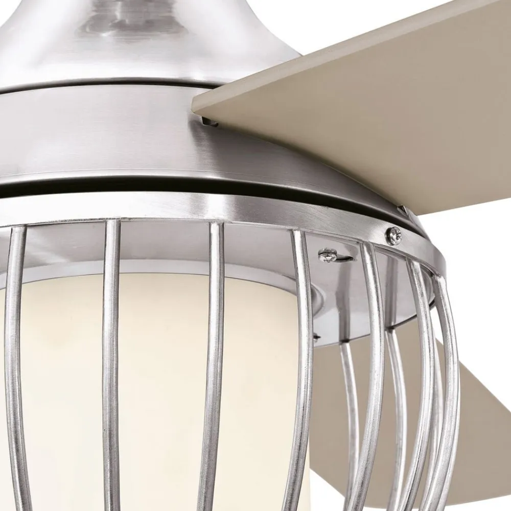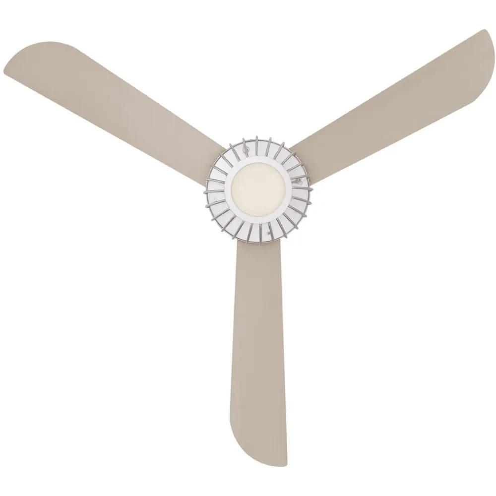 Graham-loftventilator med burskærm og dæmpbart LED-lys Graham-loftventilatoren er en hvid loftventilator med tre drejelige rotorblade. Den moderne, burformede lampeskærm omslutter diffusoren af matteret opalglas. LED’en giver et varmt hvidt, dæmpet lys. Funktion: Ventilatoren startes og stoppes med den medfølgende fjernbetjening. Der kan indstilles 3 hastigheder og 3 watt, og det er muligt at skifte mellem sommer- og vinterfunktion. Fjernbetjeningen kan også bruges til at tænde og slukke for lyset og dæmpe det. Tekniske data: Effekt pr. hastighed: – 54 watt ved 204 o/min – 29 watt ved 146 o/min – 16 watt ved 101 o/min – Luftgennemstrømning: maks. 134,5 m³/min