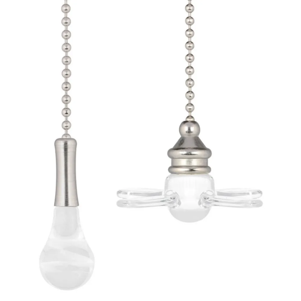 Trækkædesæt til loftsventilatorer De dekorative trækkæder er dekoreret med små modeller af en ventilator og en klar glaspære, så brugeren let kan skelne mellem ventilatorens funktion og det indbyggede lys. Begge trækkæder er fastgjort med kuglekæder i børstet nikkel. Sættet er ideelt som erstatning for defekte kæder eller som et dekorativt og funktionelt element til eksisterende loftsventilatorer.