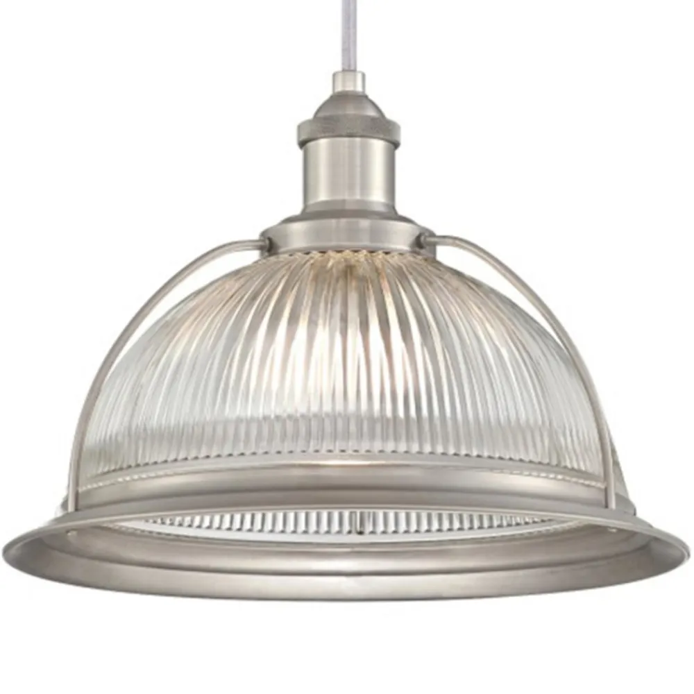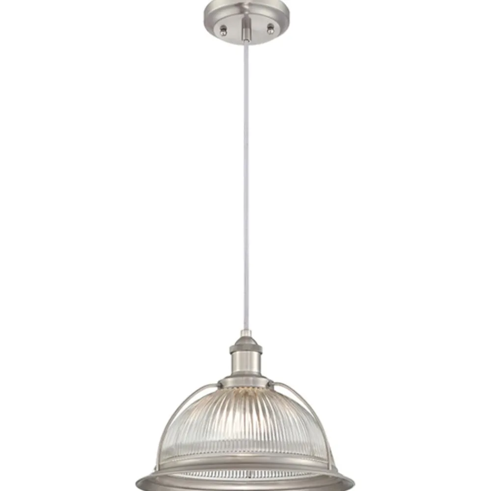 Pendellampe med én flamme og stel i børstet nikkel Denne pendellampe er visuelt tiltalende med sit riflede, klare glas, som danner lampens halvcirkelformede skærm. Skærmen er indrammet af en ramme med nikkelfinish, der flatterer det klare glas på en glamourøs måde. Det nikkelfarvede look går igen i den runde baldakin. Det flettede reb, der bruges til at hænge lampen op, har en diskret og diskret effekt. Dette armatur skaber en attraktiv og livlig belysning, som giver et strejf af retro og industriel stil til dine egne fire vægge. Det er ideelt til almen belysning. På grund af den åbne skærm anbefales det at vælge en attraktiv pære med filament-look.