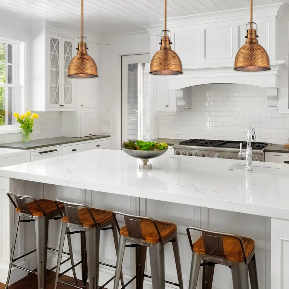 Den industrielle stil pendellampe kan justeres i højden. Den leveres med tre stænger, der hver er 24 cm lange. Afhængigt af hvor mange stænger der anvendes, er ophænget længere eller kortere og kan tilpasses individuelt til de rumlige forhold. Den formede, halvcirkelformede skærm er dækket af en attraktiv kobberfinish. Overfladen er forsynet med et hulmønster, der er hamret, hvilket også viser mønsteret på indersiden. Takket være den varme kobberfarve, der også er inde i skyggen, udsendes et meget varmt lys, der skaber en hyggelig atmosfære. Hængelampen supplerer både industrielt design og vintage- eller retro-stilarter og skærer en fin figur over ethvert bord.
