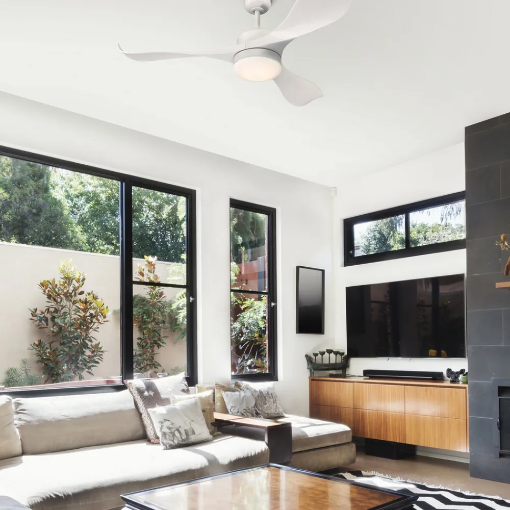 Pierre loftventilatoren er visuelt meget tiltalende og passer perfekt til den moderne stue. De bølgelignende, buede plastblade er helt hvide og suppleres optimalt af det hvide hus og glasdiffusoren af opal matteret glas. Bag denne skærm er der dæmpbare LED’er, som giver et behageligt og blændfrit lys i rummet. Inkl. fjernbetjening med batteri (1 x A23) og to trækkontakter.