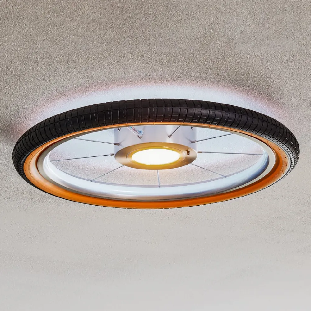 Loftslampen er fremstillet af aluminium og stål. LED-lyskilderne er placeret i midten og på indersiden af dækket. Hjulet kan styres via den medfølgende fjernbetjening. Med den kan RGB-farveskiftfunktionen anvendes, som giver omgivelserne forskellige farver. Det er også muligt at justere lysets lysstyrke. Den varme hvide lysfarve skaber en behagelig og hyggelig atmosfære.