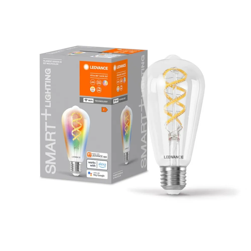 LEDVANCE SMART WiFi E27 LED-lampe Edison Filament ST64 klar med 4,8W, RGBW, til styring via WLANVariabelt hvidt lys eller alle farverige gradueringer til konventionelle armaturer tilbydes af denne smarte E27 ST64 LED-filamentlampe Edison i rustik form med klar glaspære. Tænding, dæmpning og trinløs regulering af lysfarven fra varm hvid til dagslys samt valg af farvet nuance sker via app på smartphone/tablet eller via stemmekommando. Koblingen med tablet/smartphone eller smart integration sker via WLAN takket være SMART WiFi-teknologien, uden behov for en gateway eller bridge. Særlige funktioner/kompatibilitet: – kan styres med LEDVANCE SMART WiFi-appen (fås gratis til iOS og Android); muliggør forudindstillinger og automatiseringer – styring via Google Assistant eller Amazon Alexa mulig – dæmpbar – lysfarve: hvidt lys med 2.700 – 6.500 K eller farverigt (op til 16 millioner graderinger) – netværksprotokol: WiFi